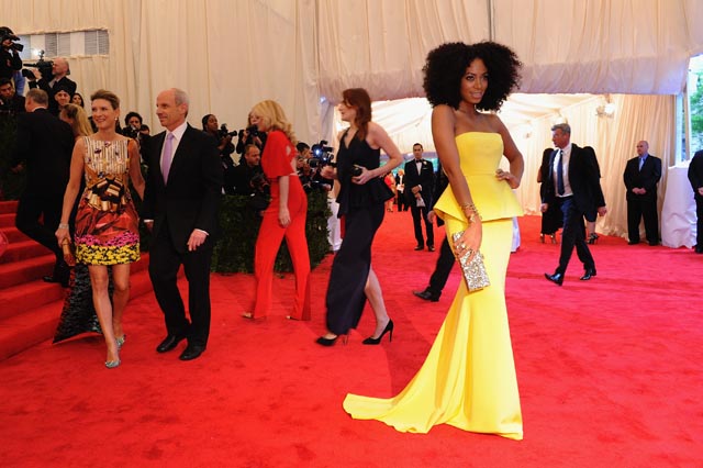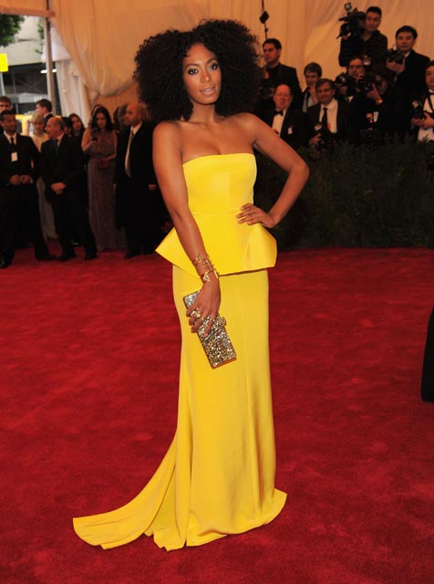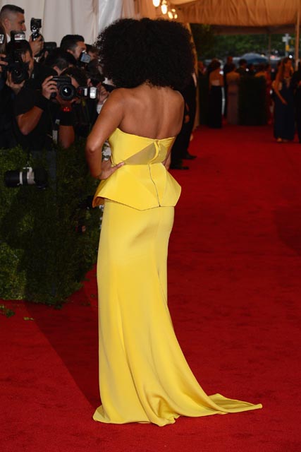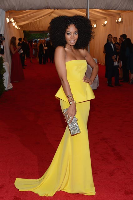Anyway, I am over peplum. And I do love Solange Knowles’s hair. Nobody noticed, obviously, because her sister showed up dragging a mega train but on a night of updos and loose buns, this to me was the most fun. I dream about being able to wear an afro. All the time. My hair is stick straight and flat to the head. Is it because we always want our opposite?