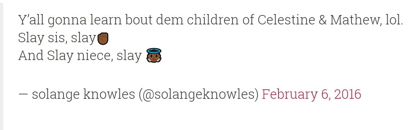 Two years ago, in a post about Solange, I wondered how and when Solange would find her peace and her place. Her “Seat At The Table”. Let me admit here, in bold, that I underestimated Solange. I did not think music was how Solange would get there. But Solange delivered a masterpiece, the same year that Beyoncé delivered a masterpiece. You remember what she tweeted back in February, right after Beyoncé dropped Formation?