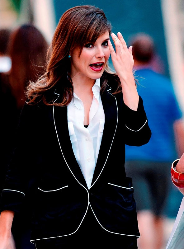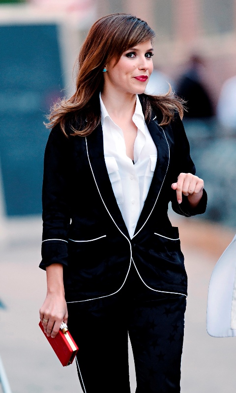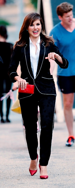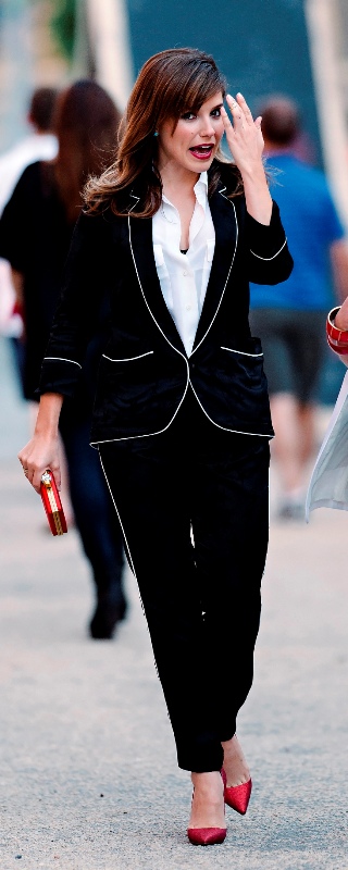 Here’s what I don’t like about this suit: that she could leave a pair of black and pyjamas well enough alone and had to accent it with red.