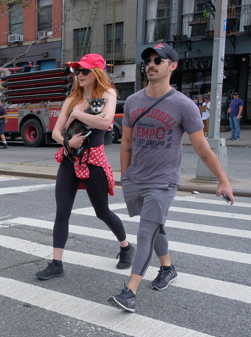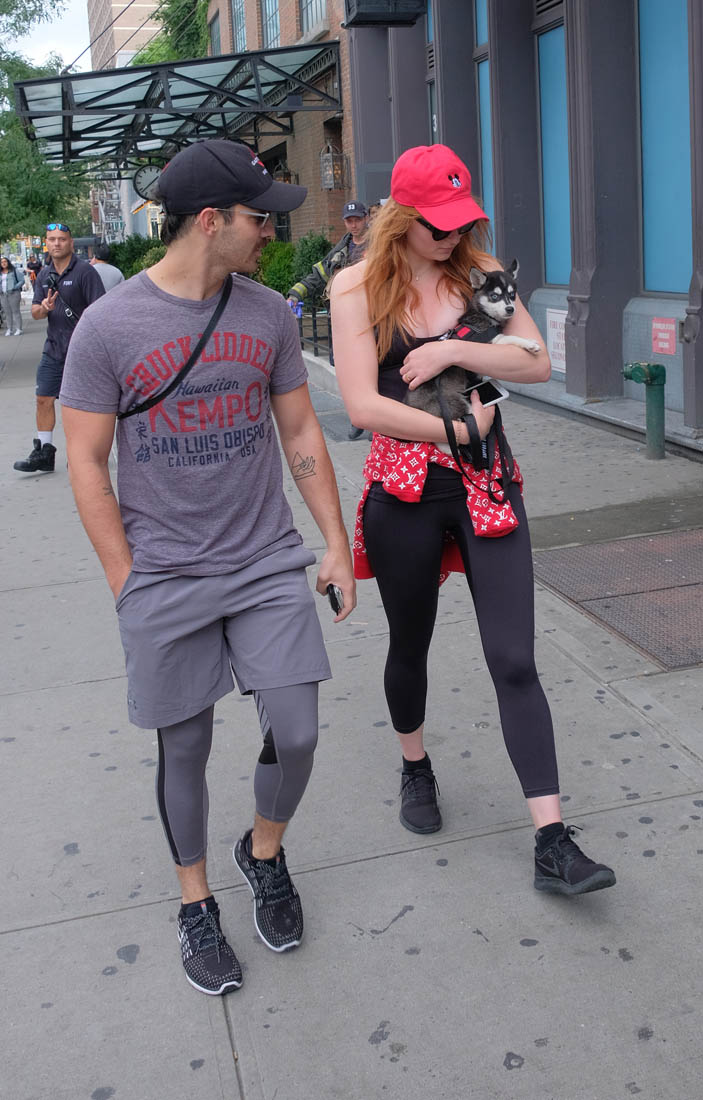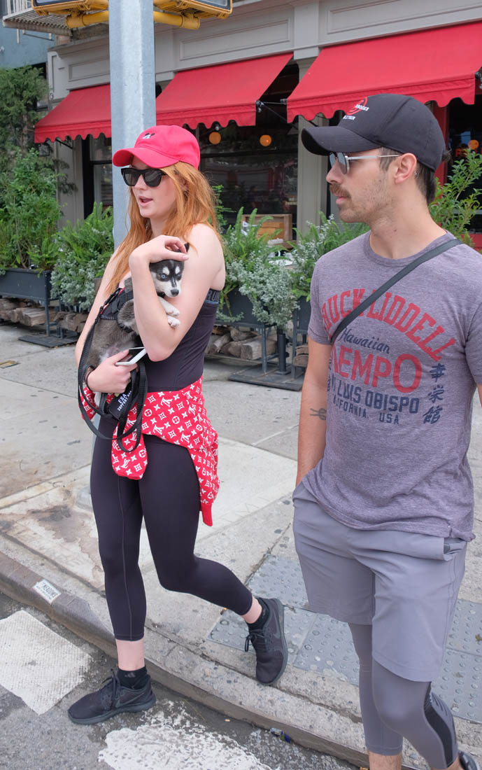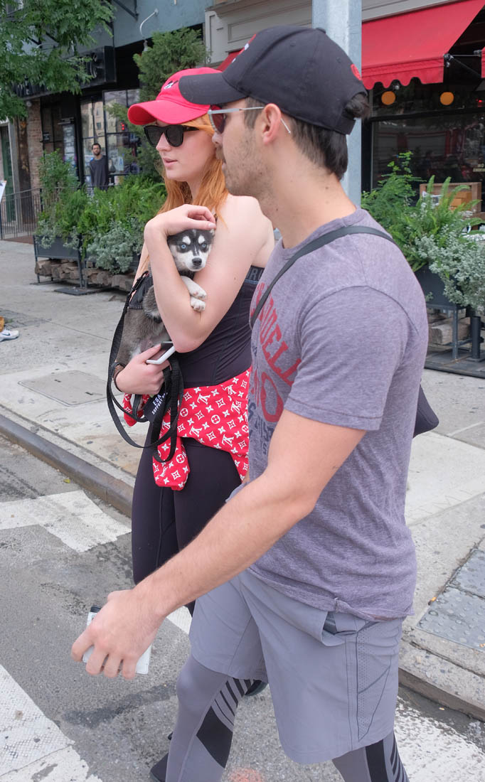 Here are new photos of Sophie Turner and Joe Jonas out in New York City with their adopted Siberian Husky puppy/ direwolf named Porky Basquiat. Sophie Turner and Joe Jonas really want us to know that they know who Jean-Michel Basquiat is.
