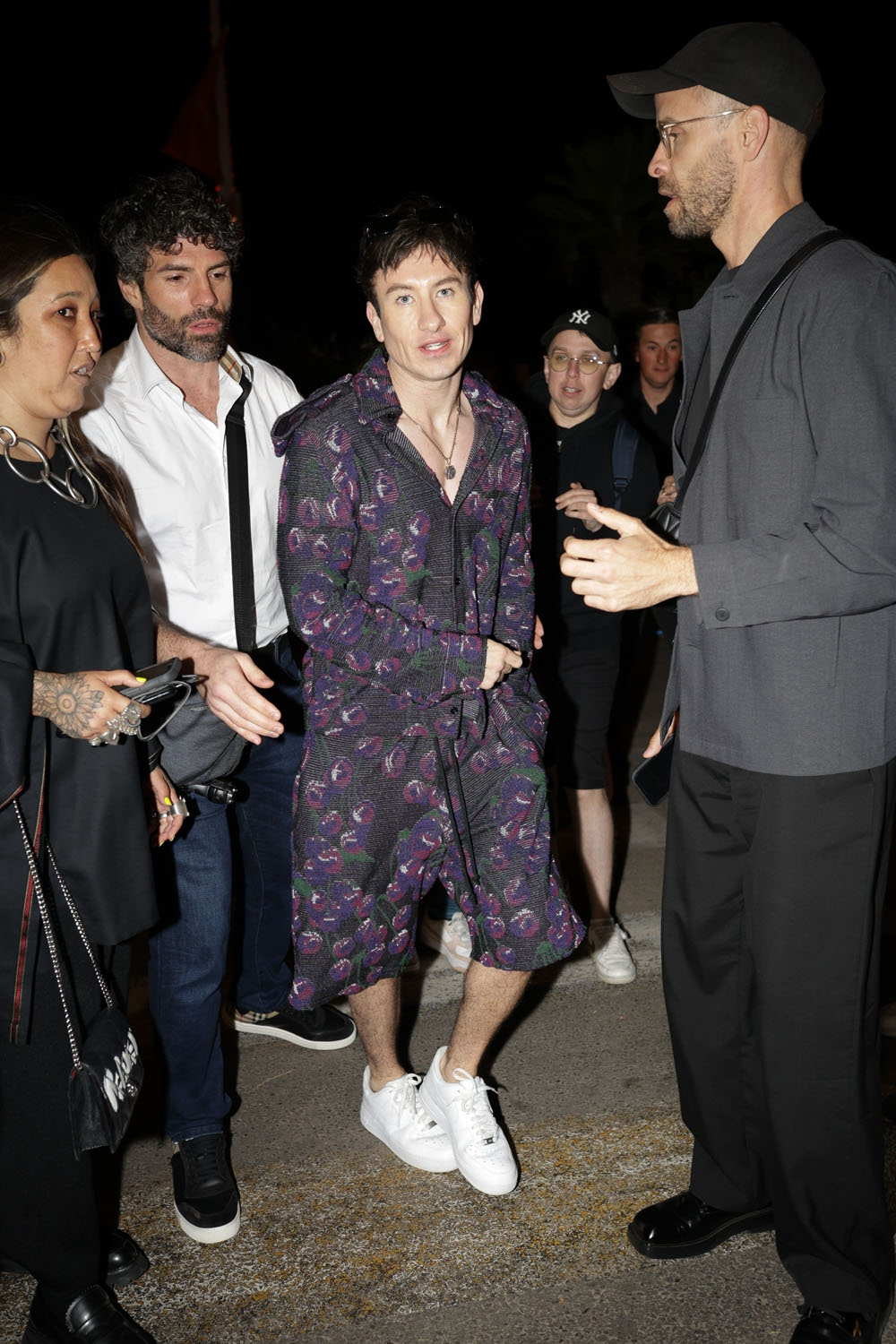 But Cannes is more than just the Croisette! There were parties, too. Barry Keoghan is making the most of his trip, popping up at the Nespresso x Brut party—along with Hunter Schafer in a GREAT floral dress with POCKETS—after the premiere of Andrea Arnold’s new film, Bird, in which Keoghan stars. I thought he was wearing fancy pajamas at first glance, but Barry’s purple ensemble is fancy leisure wear? I’m honestly not sure what that is, and I’m not sure I actually like his style, but Barry Keoghan has rapidly become a reliably eccentric dresser. Sabrina Carpenter is performing on SNL this weekend. Do we think Barry will be there?