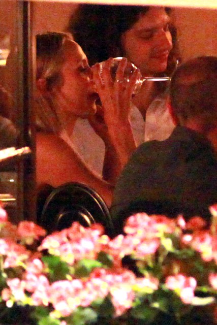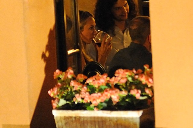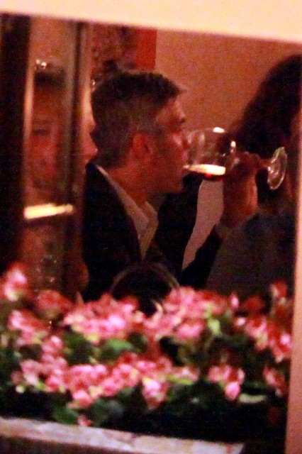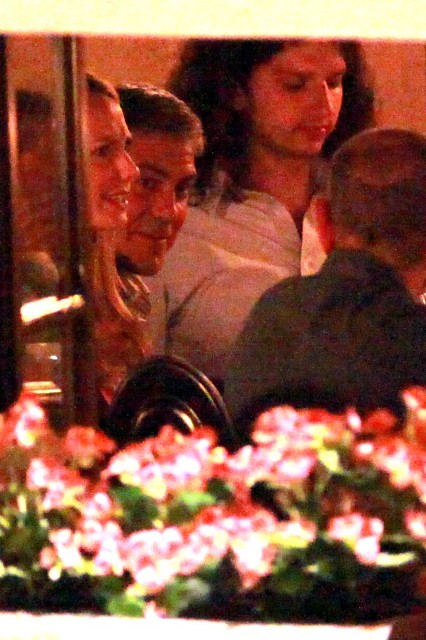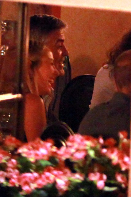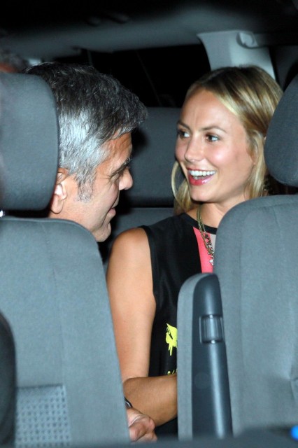 Seems like every night they’re entertaining his guests. Last night was no exception. George and Stacy were out to dinner with yet another new group of arrivals at Villa di Clooney where Stacy tweeted she enjoyed the limoncello sorbet. Along with, I’m assuming, several cocktails. I’ve seen these two party. They like to throw it back. At TIFF they were throwing it back hard and she was matching him, not only in drink but in enthusiasm. This is not a girl who pouts by his side requiring whispers and caresses; she gets right in there, and is apparently very well liked. Even by the dog, Einstein. Here’s another shot she posted of the two of them cuddling.