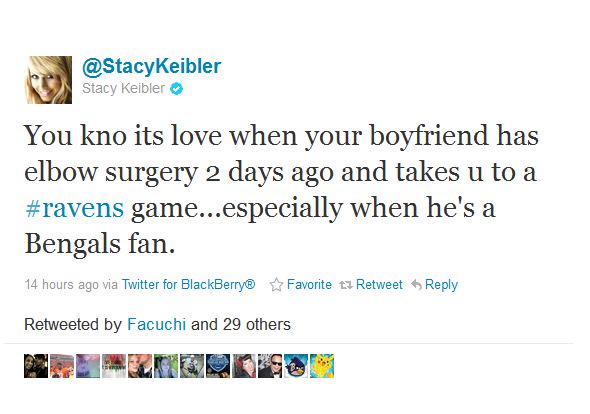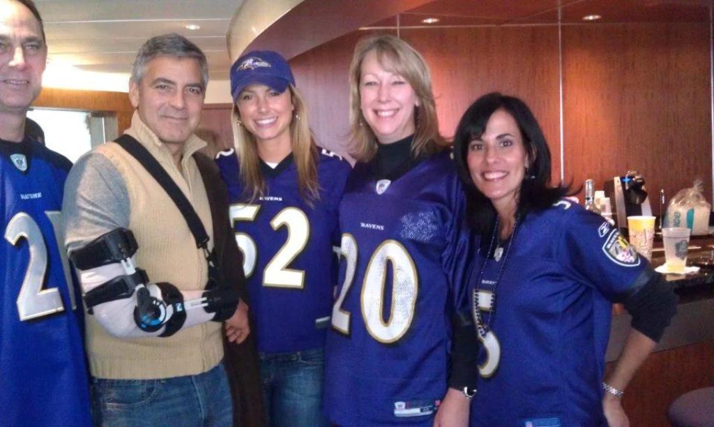 Keibler is a Baltimore Ravens fan. George Clooney cheers for Cincinnati. They went head to head yesterday for a big AFC North showdown. Keibler and Clooney were at the game. And Stacy was eager to share that with her followers:
