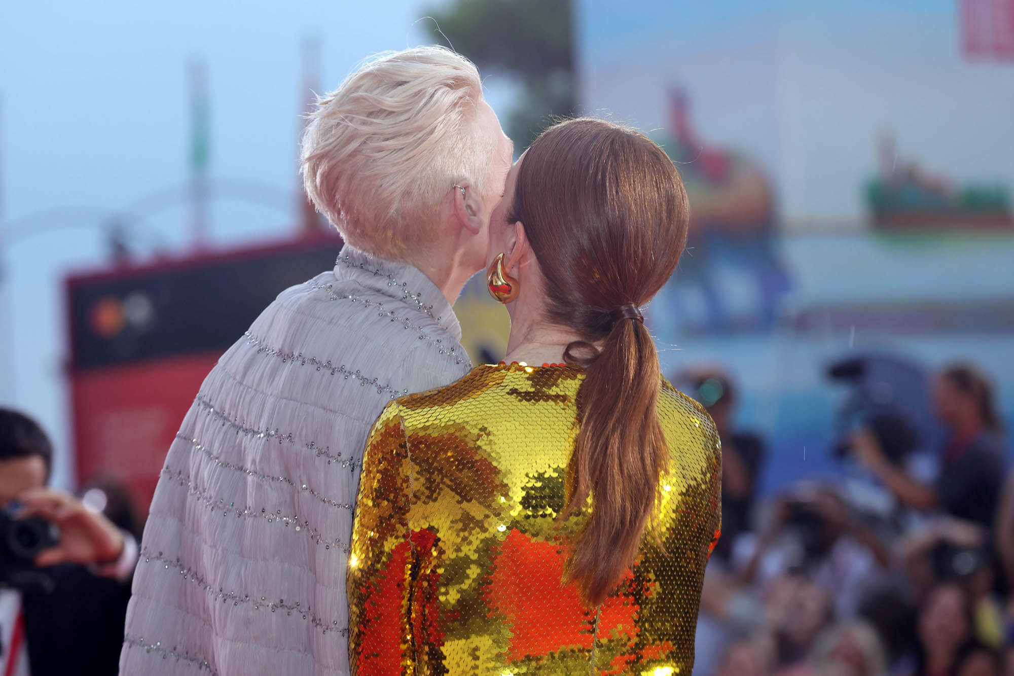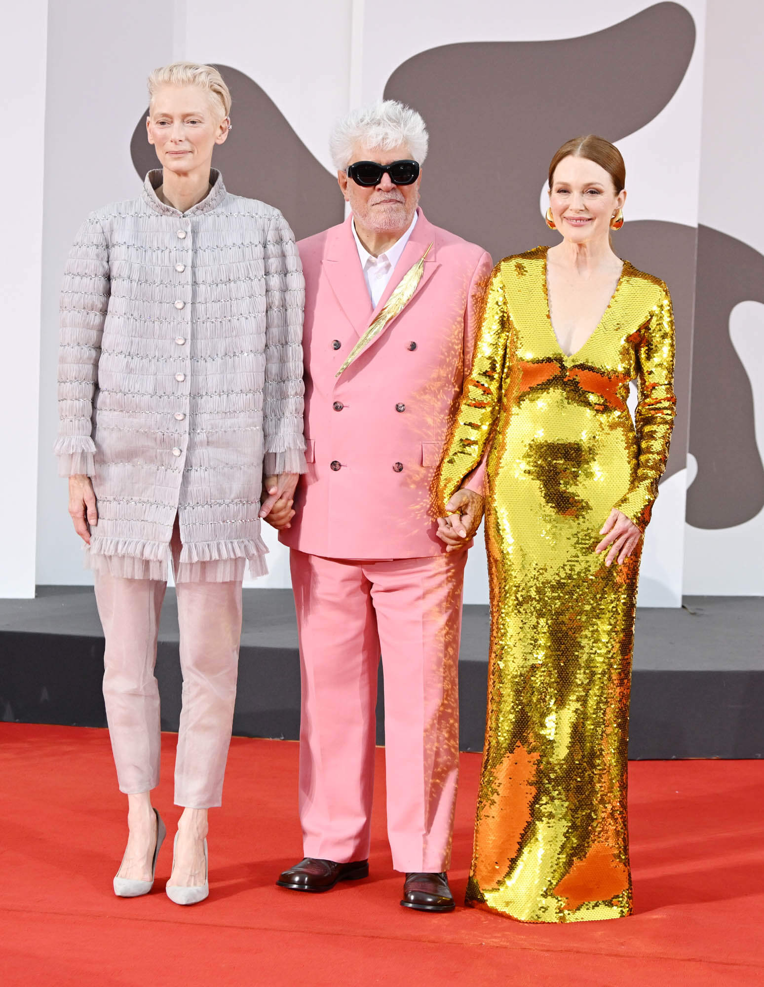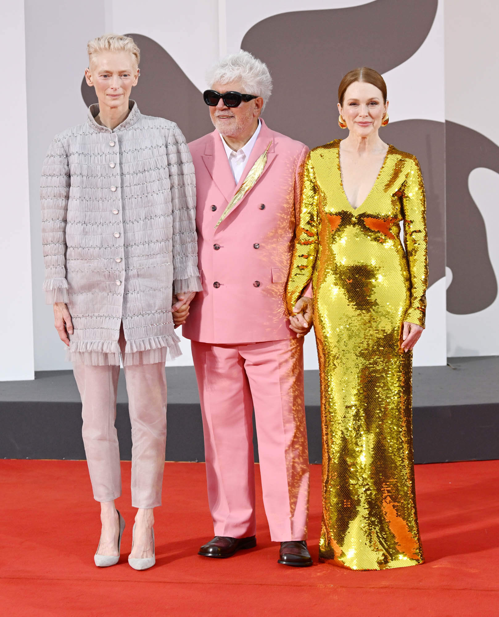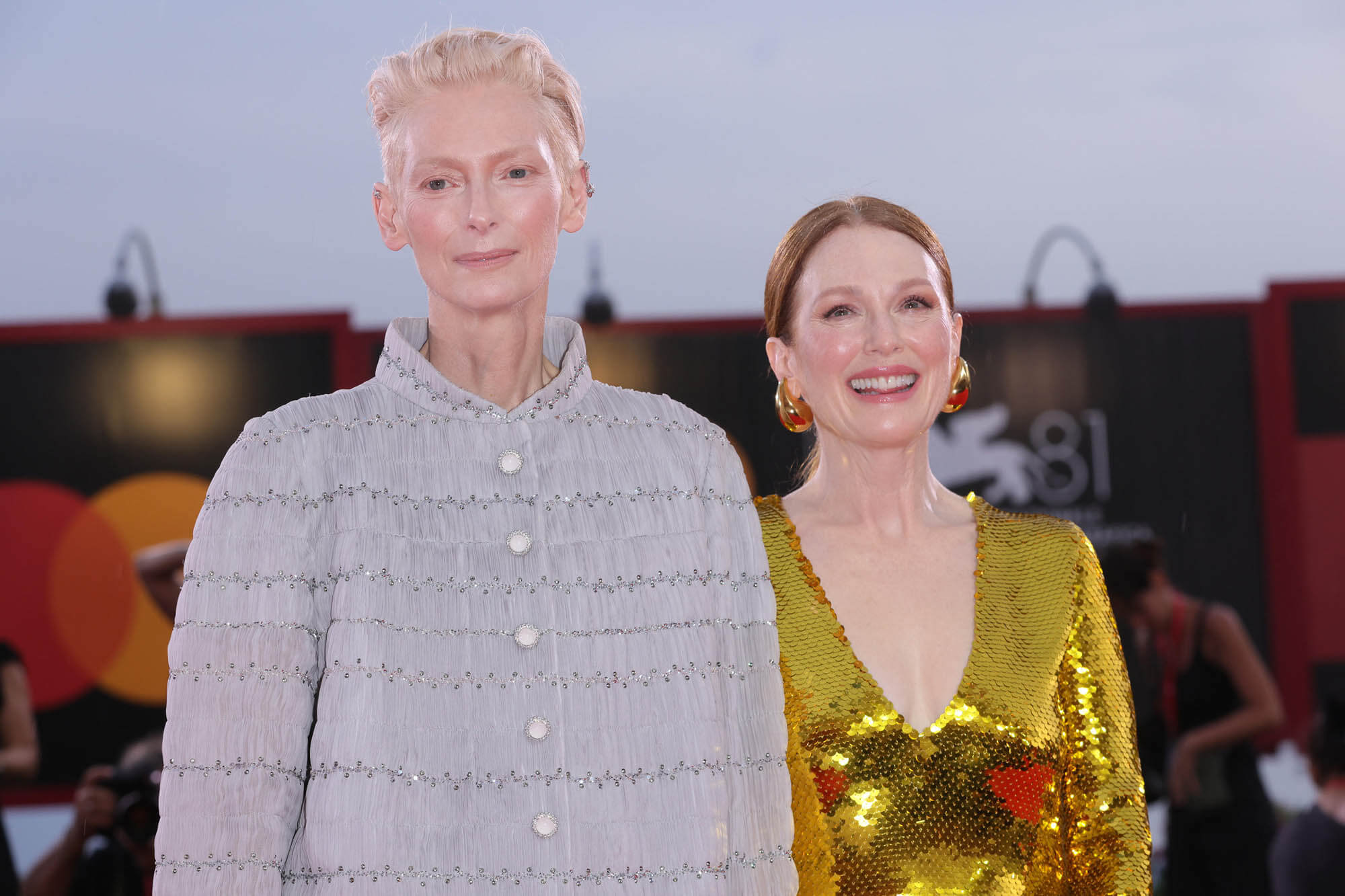 The Room Next Door will next be screening at TIFF. Here are Julianne and Tilda at the gala in Venice last night reacting to their ovation. This cracked me up – hand and finger hearts, appreciate the effort, but terrible execution. Tilda in particular is killing me with her pinch.