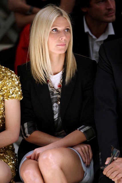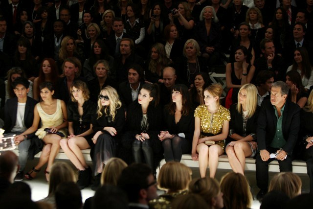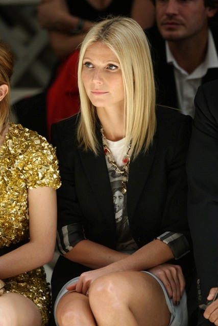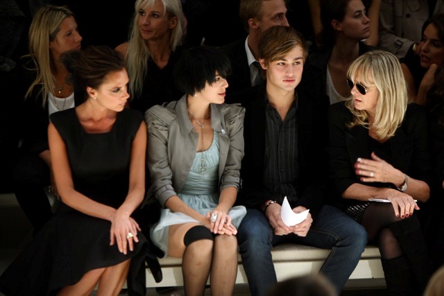 In another section, Victoria Beckham was also seated front row…but she wasn’t invited to the girl party. It’s been nearly 10 years since Burberry presented at London Fashion Week after a decade of “chav”, suffering through the soiling of the brand thanks to tacky ass Euro footballers and people like… Posh Spice. So the presence of the GOOP and her girls is a huge coup for the label which, obviously, would rather associate with fresh young Emma Watson than with the orange of Mrs Beckham who may be trying to reinvent herself as some kind of style icon but who still cannot shed her chavvy past.