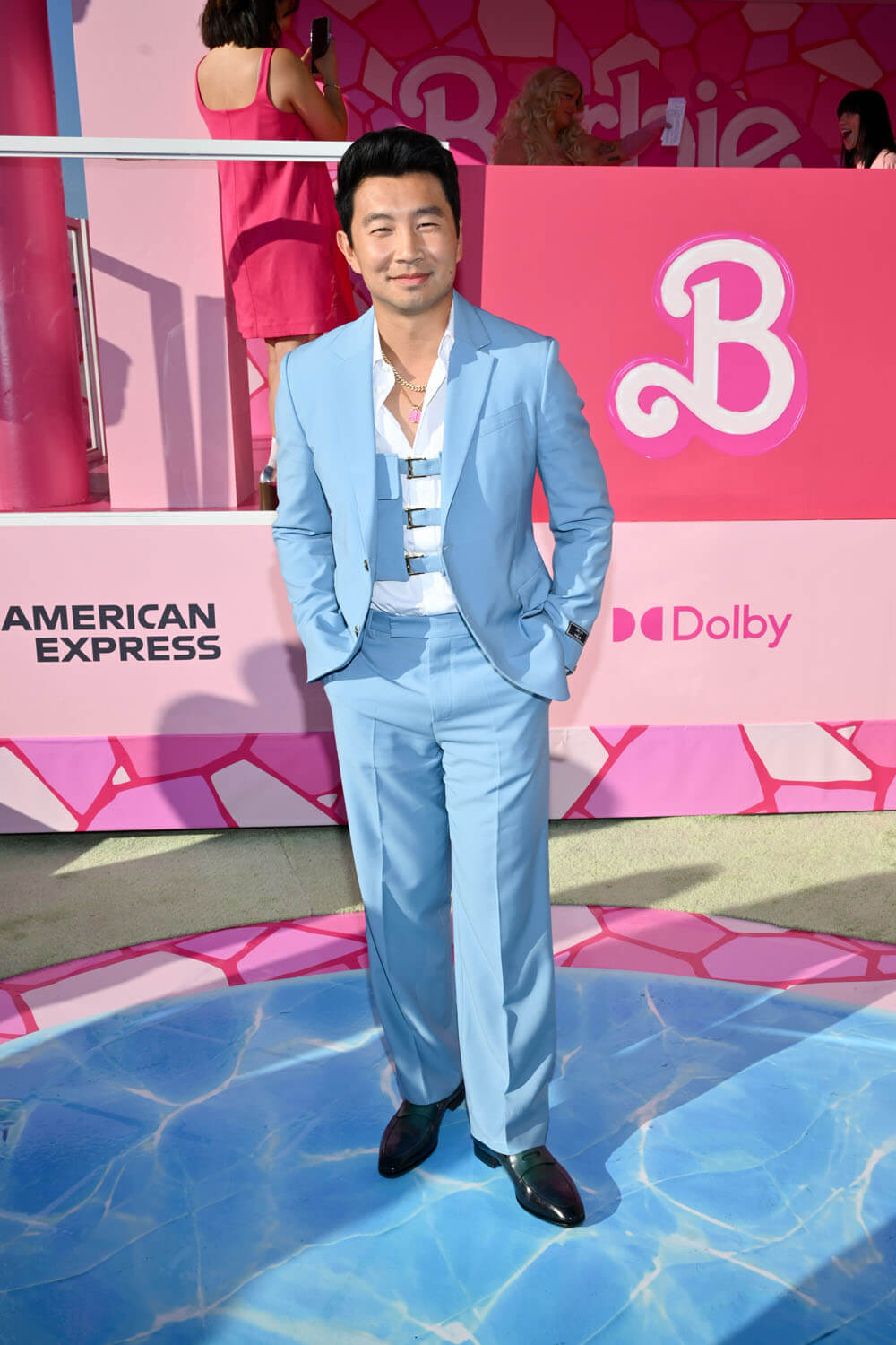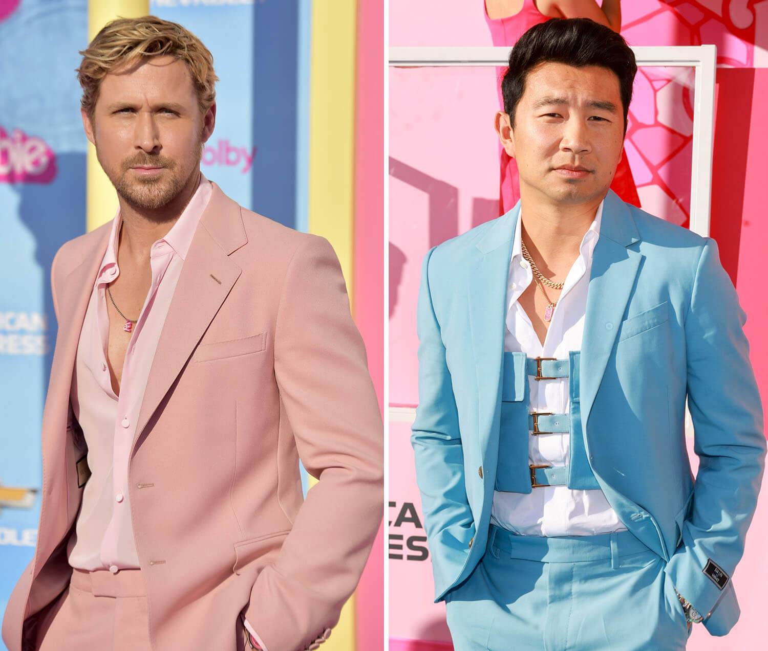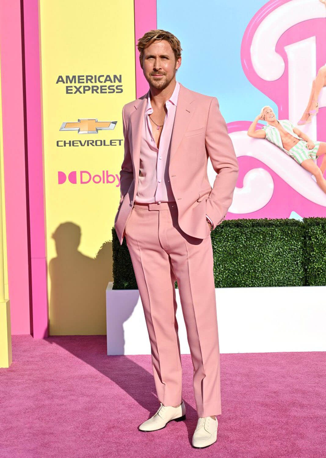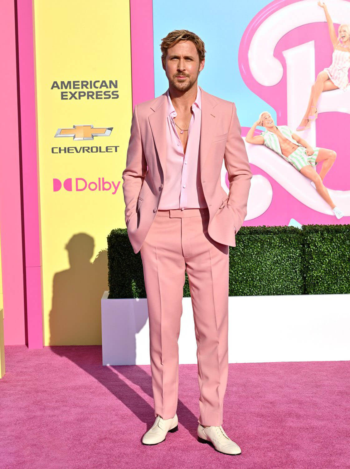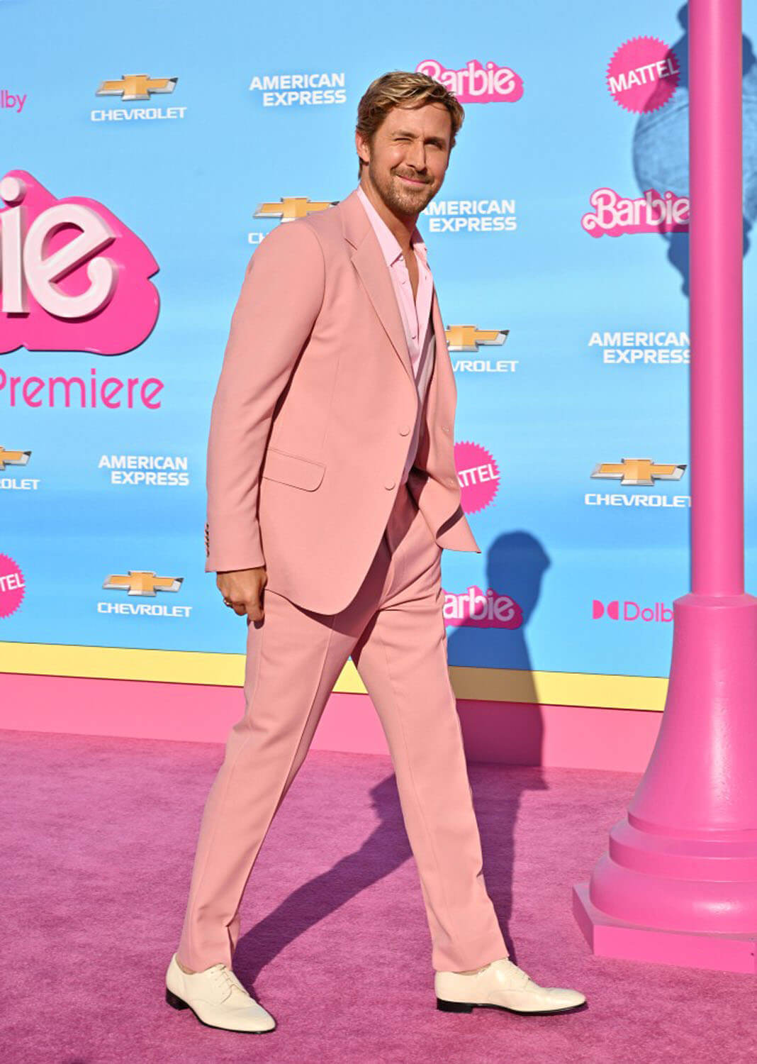 Should we bring some Kenergy to this party? I wonder if they all checked in with each other about the carpet wardrobe – like did Ryan Gosling text Simu Liu all like, “what are you wearing?” Does the main Ken get pink privilege? Ryan has always looked great in pink, from Drive to Barbie. And he’s been leaning right into the spray tan and that deep V. Which I appreciate. If you’re going to play Ken, you might as well Play Ken.