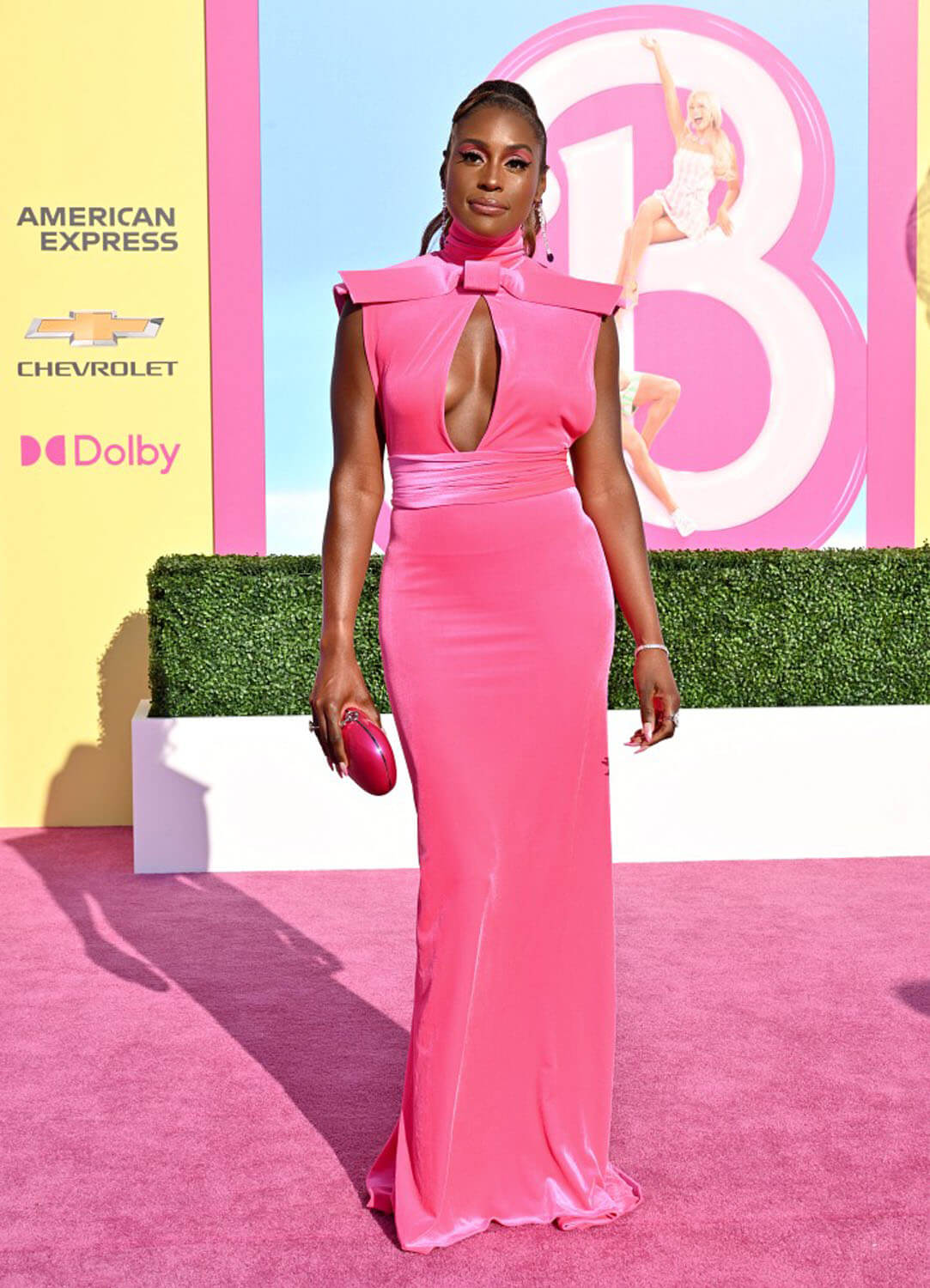My favourite of all the pinks though is Issa Rae. It’s body-con and full length with an open chest, nothing we haven’t seen before but what sets this apart are the wide shoulders to accommodate the bow that stretches from right to left. She looks like a gift!