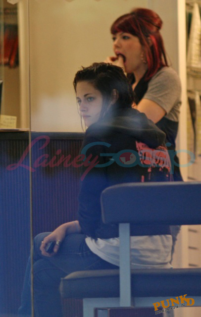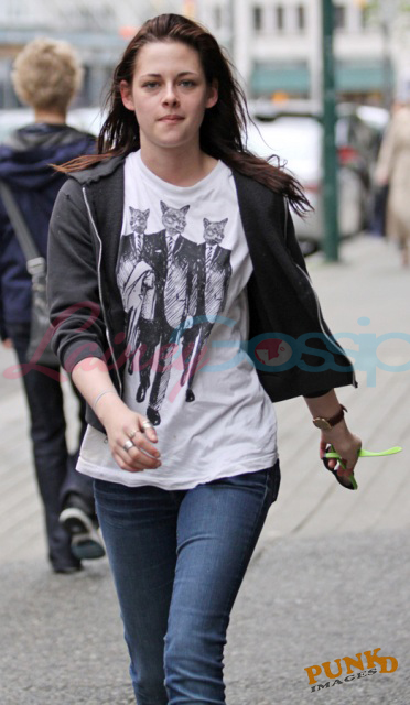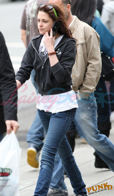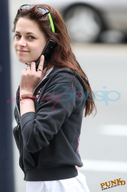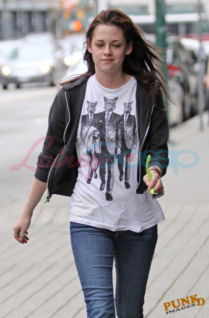 First - Kirsten Stewart in Vancouver on Monday, day after the New Moon wrap party, where my sources say she was smoking some BC bud, on her way in and out of a hair appointment looking like it was a rough night. Or a great night. Pretty much what Laura and I look like now. Except for us it’s been 4 nights in a row. Vodka face bloat, not cute.