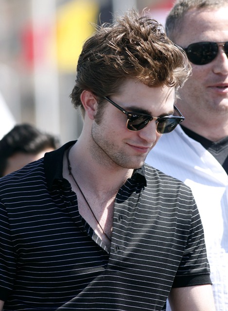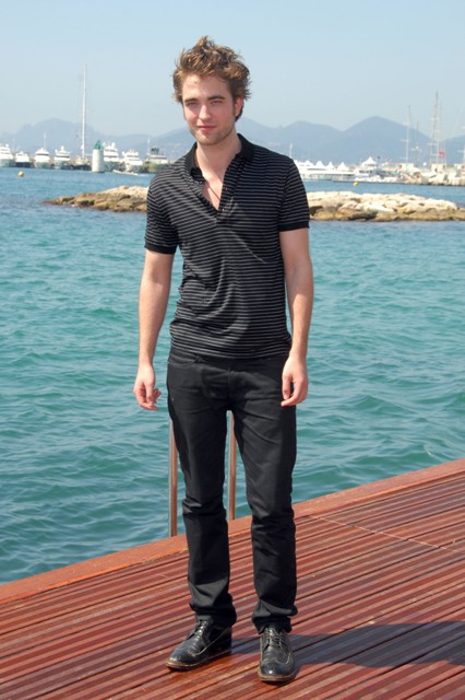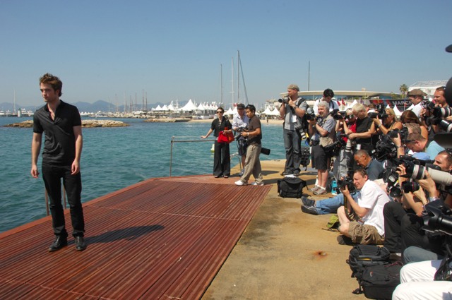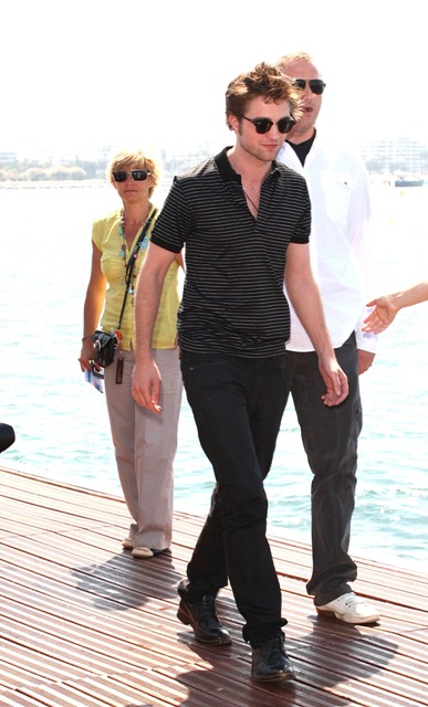 Over in Cannes, this morning, Robert Pattinson, after a boozy night on Paul Allen’s boat, posed for a photo call on the beach before international interviews all day. Laura was working at the Grand and saw him going from outlet to outlet, running his hands through his hair, dutifully promoting Twilight/New Moon. Am told he seemed overwhelmed by the absurdity of the situation – on a dock, by himself, photographers calling out. It was early, I was yet again rushing to the Palais to file, and once the young French tourists heard he was there, it was a hormone surge you could feel from miles away.