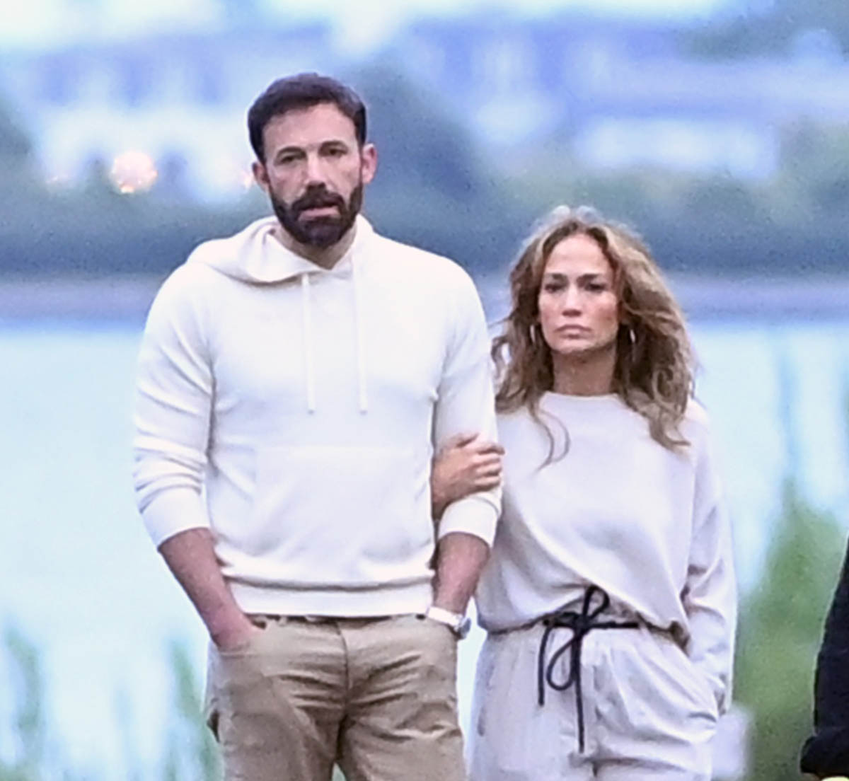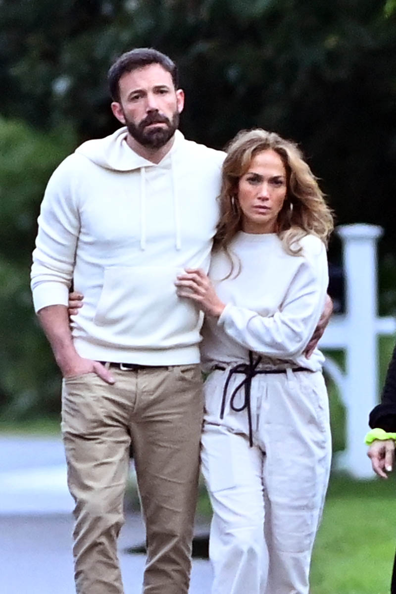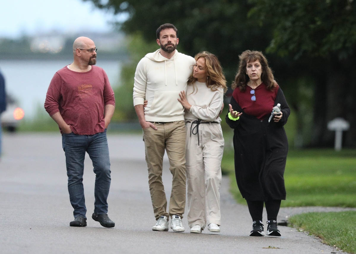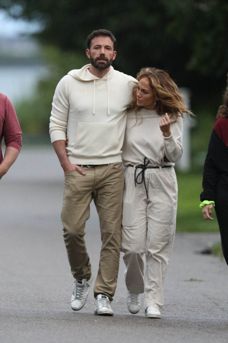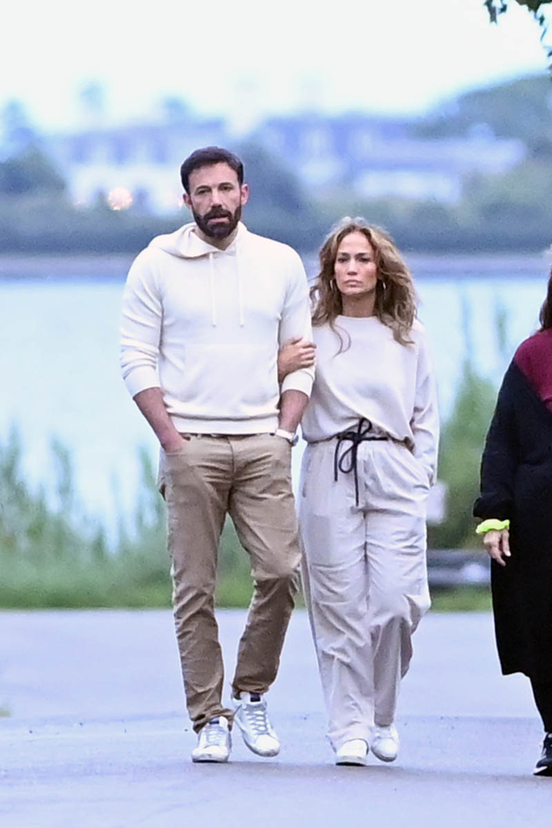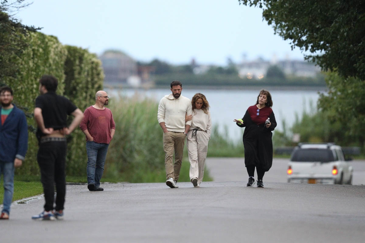 Ben and JLo held hands at Universal and were seen laughing together and with the kids and reportedly were left alone to enjoy the day. The next day, after dropping his kids off at Jennifer Garner’s, Ben joined JLo and her kids on a private jet headed for the Hamptons. Here they are looking close on a walk with a couple of friends in matching outfits. So the Summer of Bennifer continues. Can they make it to Labour Day?!