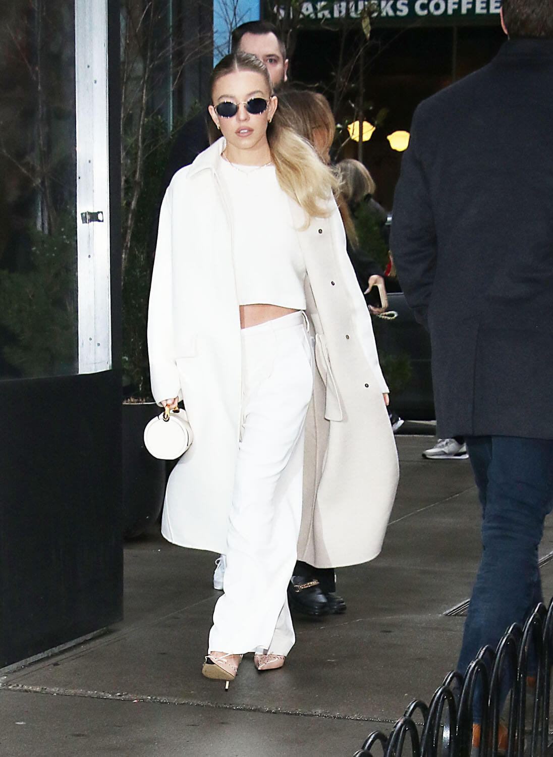 Then it was white on white on white – crop top, trousers, coat, and bag: