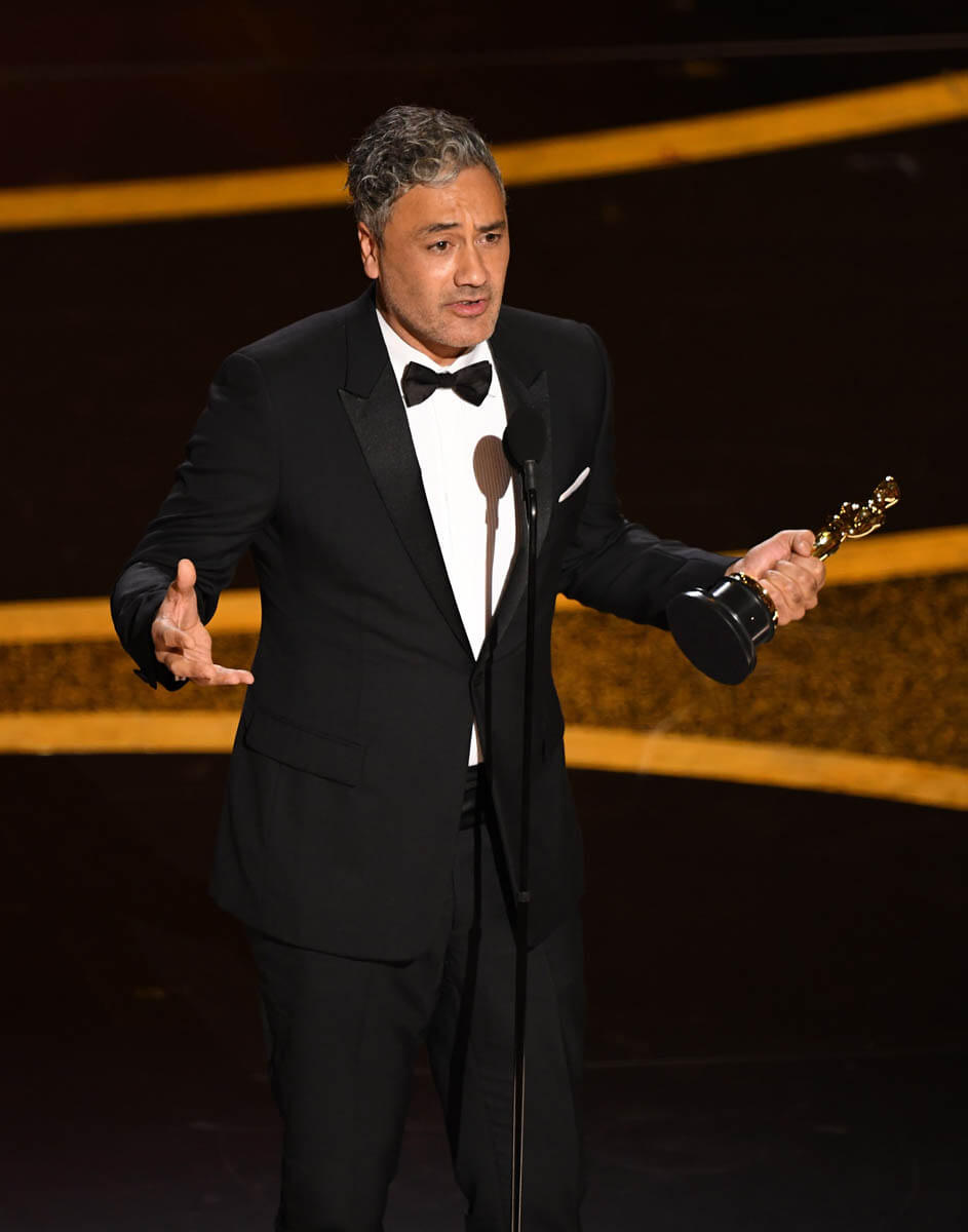 I’m not apologizing for the exclamation points because Parasite won Best Picture and my heart is still light with joy this is the energy I am taking into 2020! But I have to tell you I am more than a little disappointed that Taika Waititi wore a plain tuxedo to the Oscars! I was really hoping for some color or a cool pattern, but all we got was this plain Dior tux! It was a letdown! But then he won Best Adapted Screenplay, which kind of sucks because Greta Gerwig was right there, but also kind of good because Taika won an Oscar! Taika is now the first indigenous artist to win an Oscar in that category! Which he then shoved under a seat like it was a bulky purse! And Brie Larson captured the moment because she knows what the people want!