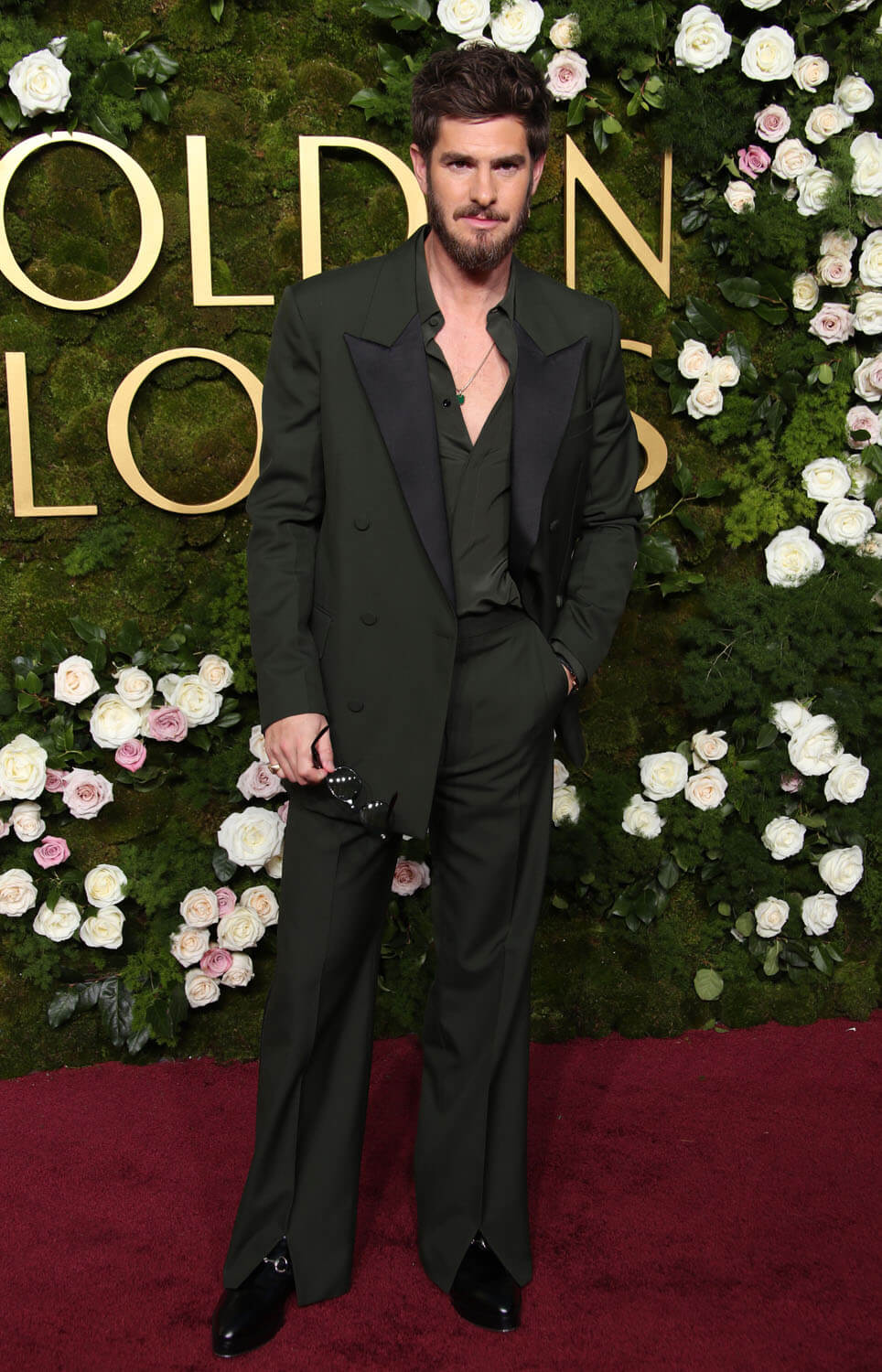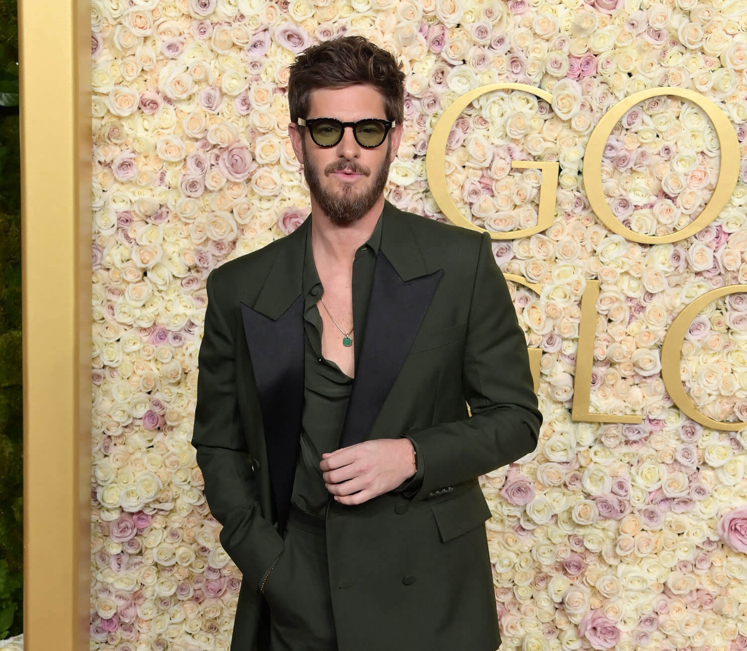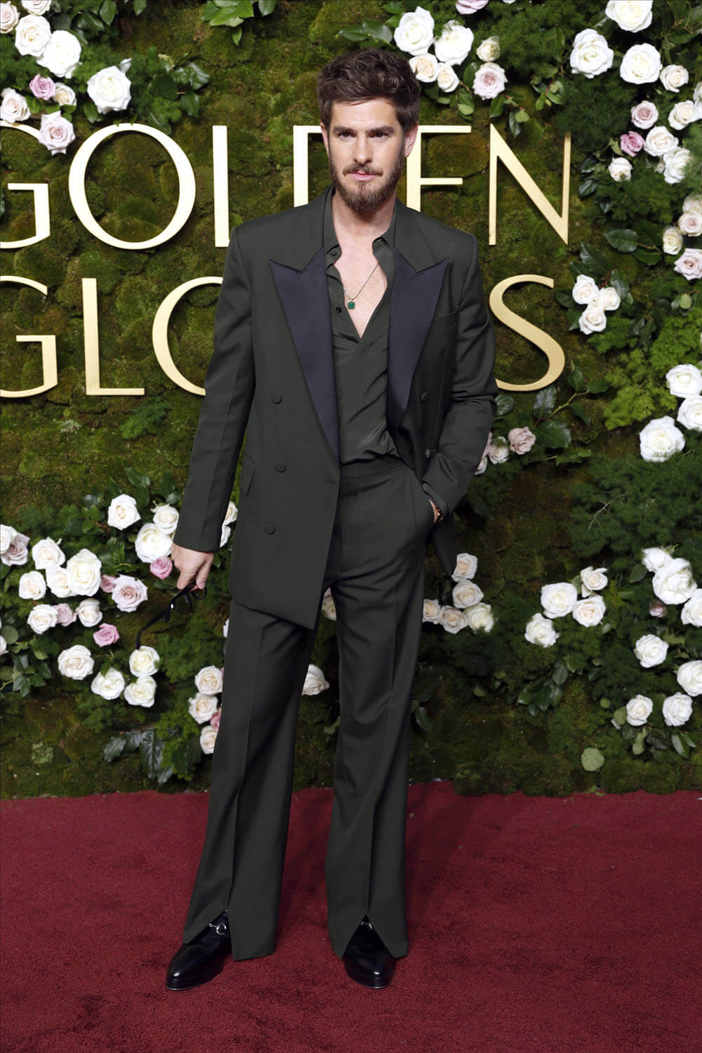 Andrew Garfield knows exactly what he’s doing here. The shirt is open just enough to see that emerald amulet that obviously holds his secrets. The green suit isn’t even the only green suit we saw tonight, I don’t think – it’s just the one that made, if I may, The Most Impact.