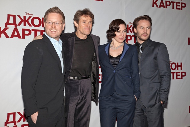 Here’s the John Carter cast, with director Andrew Stanton, in Moscow today to promote the film. They look hilariously awkward. And I think that means something. I mean, aside from Willem Dafoe, who’s not exactly a regular red carpet worker, none of these people are experienced famewhores and marketing machines. Am I imagining their shellshock, both at the jetlag, the travel, the promotional commitments, and also at the sh-t kicking they’ve been taking even more before the movie’s release?
