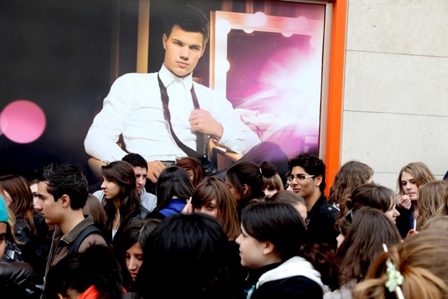 Taylor Lautner is in Paris today for some kind of autograph session. As you can see, they queued for hours for a glimpse at Tom Cruise Jr. It must have been this awesome poster. I mean... if that doesn’t say “I’m a cool man jack!” then my ma ain’t Chinese.
