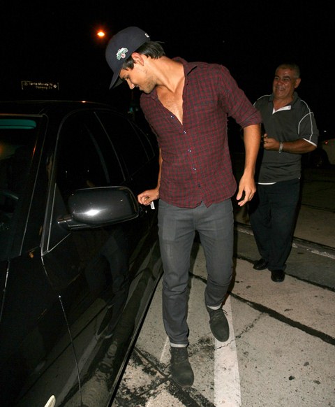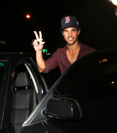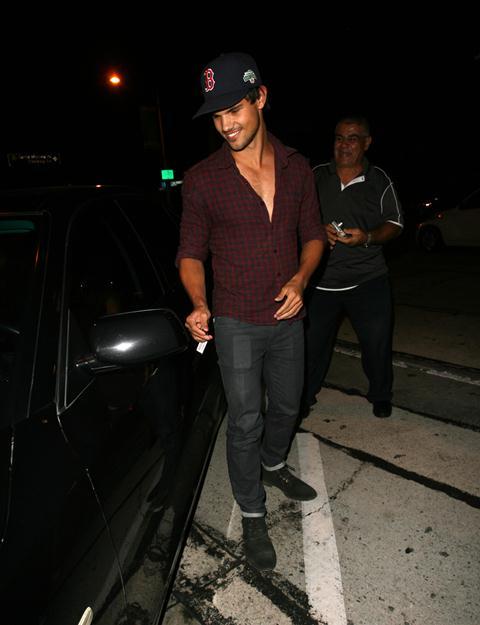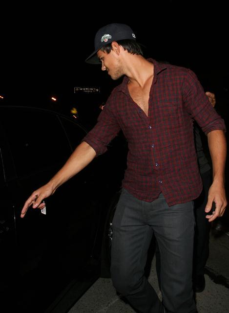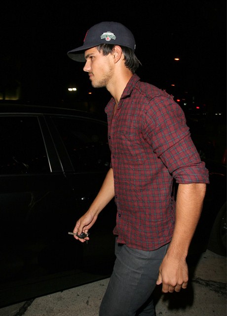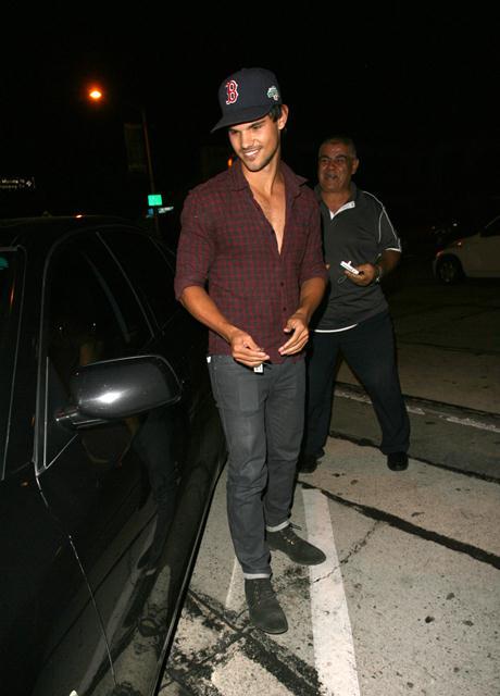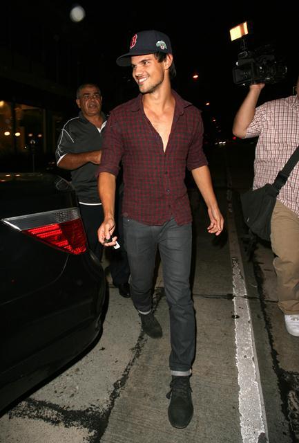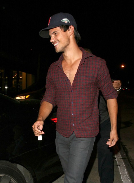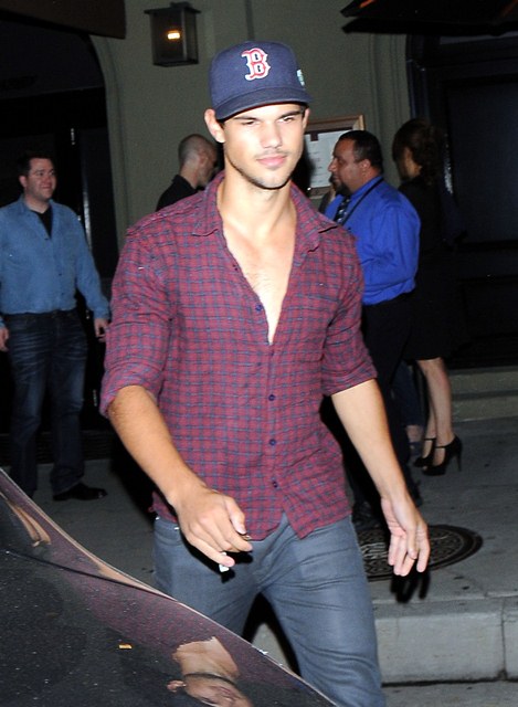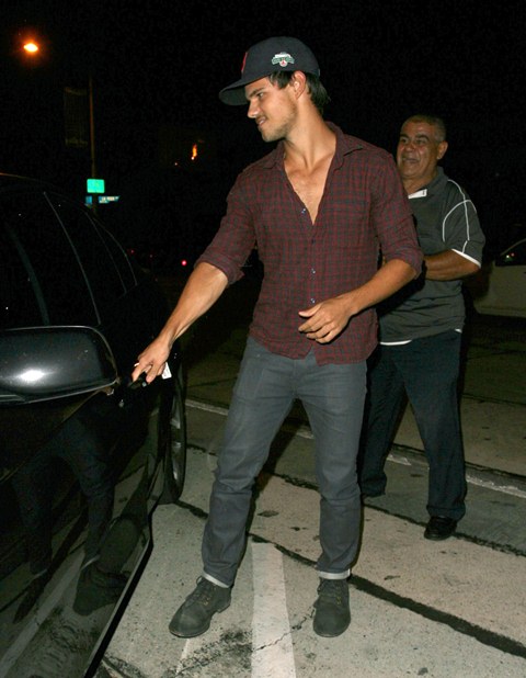 Check out Tom Cruise’s Junior Mint, Taylor Lautner, after dinner last night in West Hollywood showing you the man he is via shots of his young chest. The child thinks he’s Colin Farrell now, poor thing. If only they could all be Colin Farrell with a few strategically forgotten buttons.