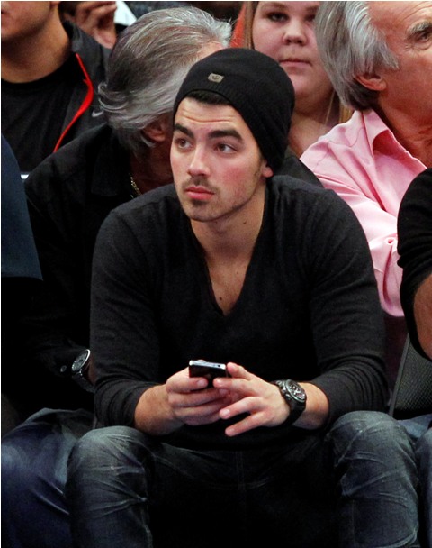 Joe Jonas hit up the Knicks game at Madison Square Garden last night fronting like he’s all manly man with the sporty sportos. Am very, very surprised that Ashley Greene isn’t hanging off him auditioning for a spot on the Knicks cheerleading squad. She doesn’t usually pass up those kinds of opportunities.
