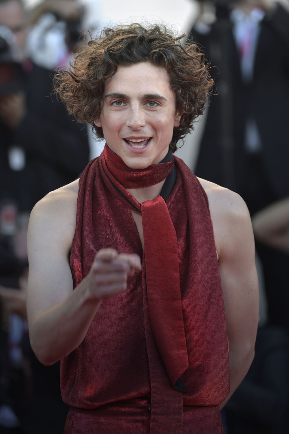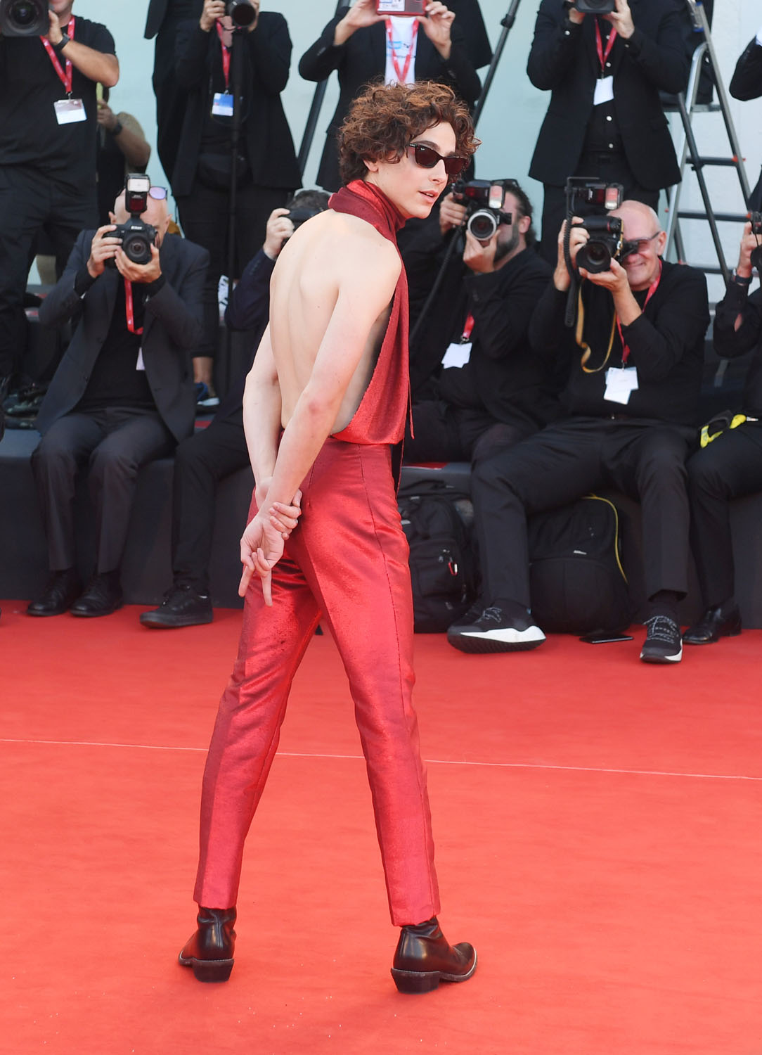 No other male actor inspires the kind of anticipation that Timmy does before his arrival. He knows…and he keeps delivering. This is custom Haider Ackermann, who collaborates often with Timmy – a shimmery cannibal red halter jumpsuit featuring a completely open back that ONLY a bonafide Movie Star could pull off.