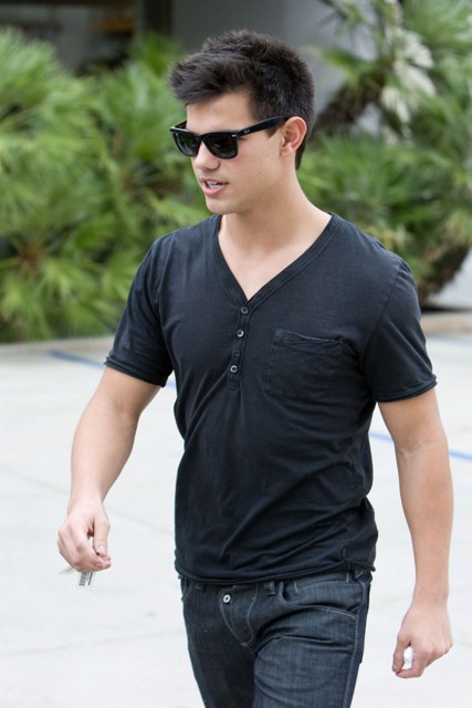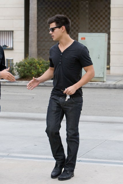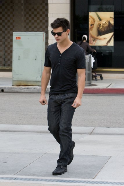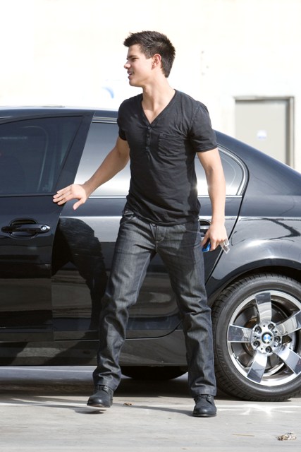 Here’s Taylor Lautner is out and about yesterday in LA. I don’t know what he has against trainers. Converse should give him a call.