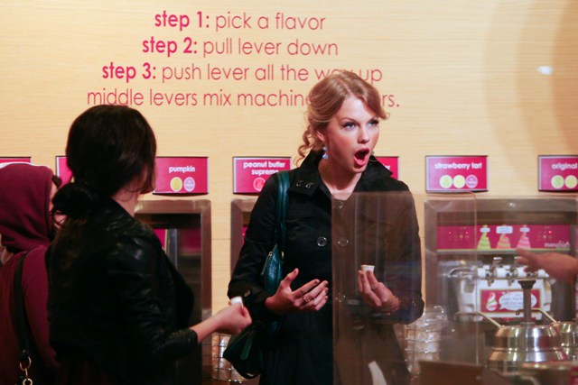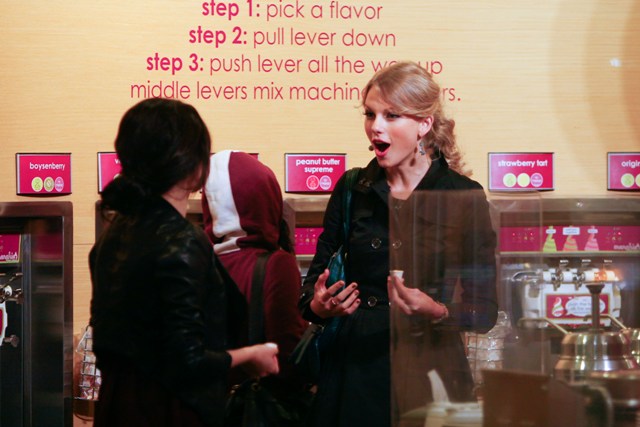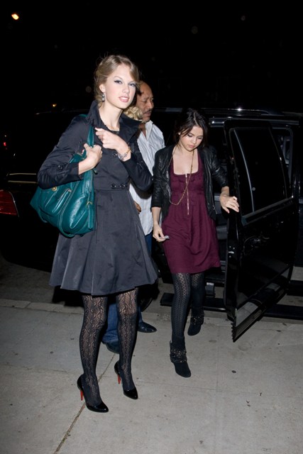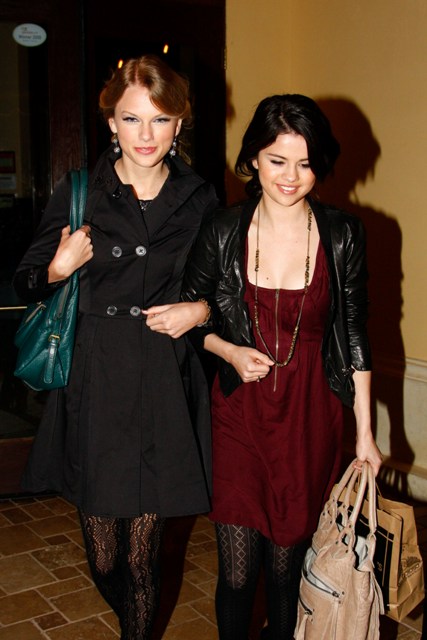 Taylor Swift and Selena Gomez went out last night for dinner and frozen yoghurt, girls on a girls’ night, just two nights after date night and a sleepover when TSwizzle hooked up with T Lautner at the hockey game and then at a hotel on Sunday. On Monday the two Taylors hooked up again – he was with her during her new video shoot and then dinner with her mom.