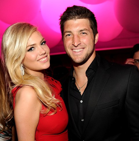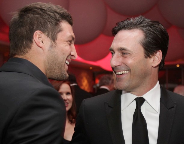 Tim Tebow was in LA for Oscar weekend. On Friday he hit up a party and met Taylor Swift. On Sunday he went to Vanity Fair and had his picture taken with just about everyone, including, as attached, Jon Hamm and Kate Upton.