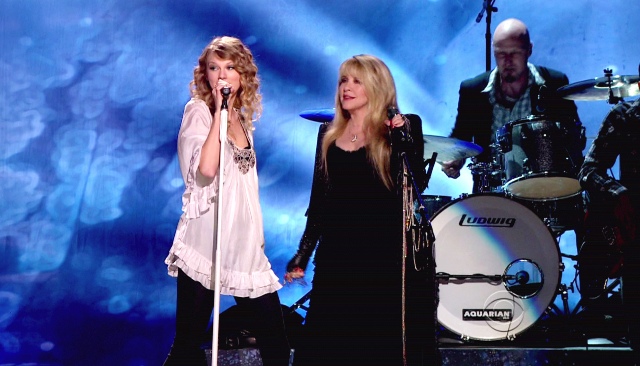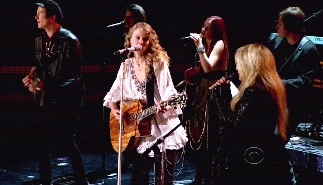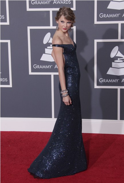 Taylor Swift is now the youngest artist to win Album of the Year. But the performance last night left a lot of room for improvement. Maybe next year we’ll grow out of the sparkly dresses too. It’s sea foam mermaid prom worn by a giraffe. Seriously, she’s so tall and lanky, that gown made her look freakishly long. See?