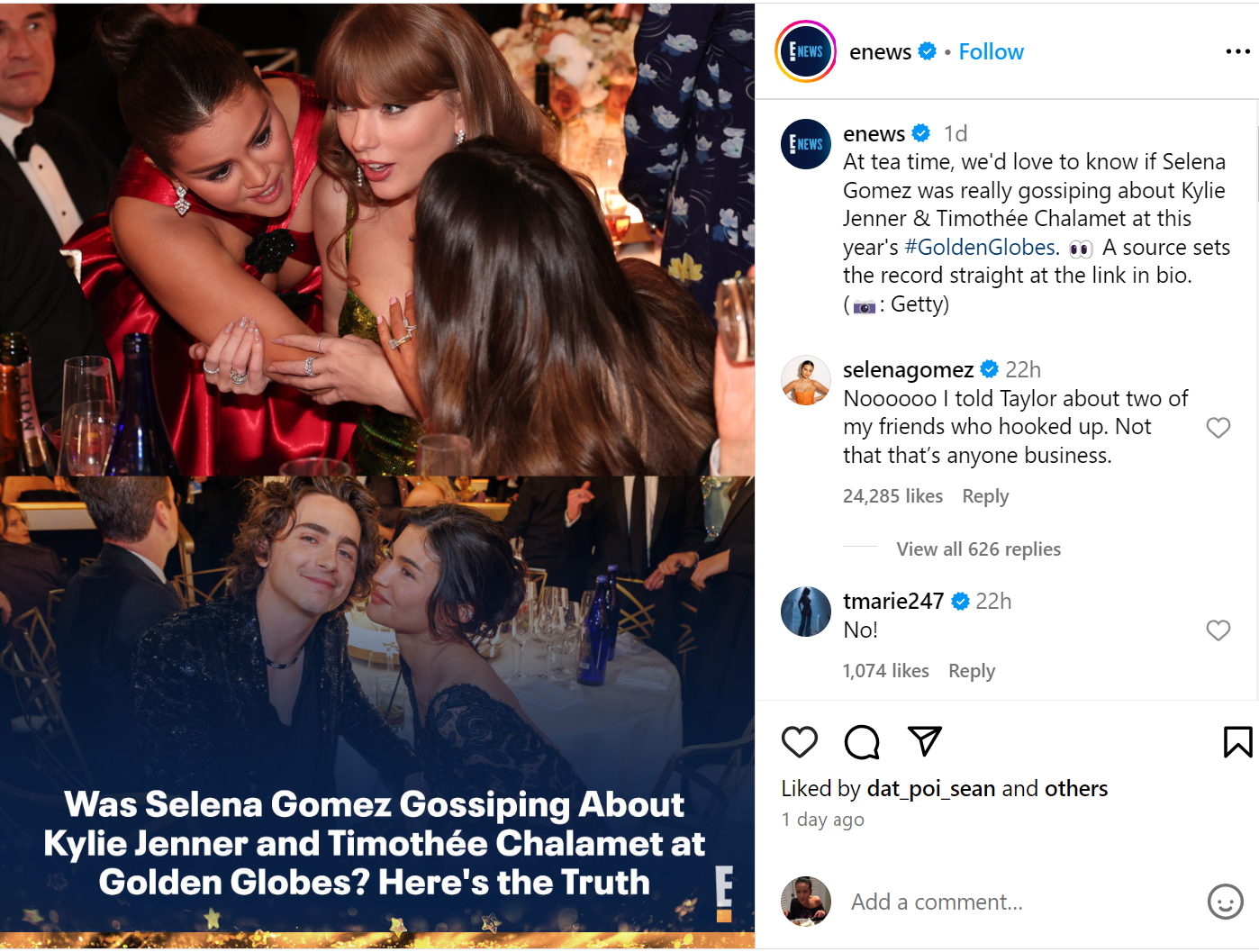 What Selena Gomez said to Taylor Swift and Keleigh Teller at the Golden Globes is the biggest celebrity gossip story of 2024 so far. Because of lipreading.