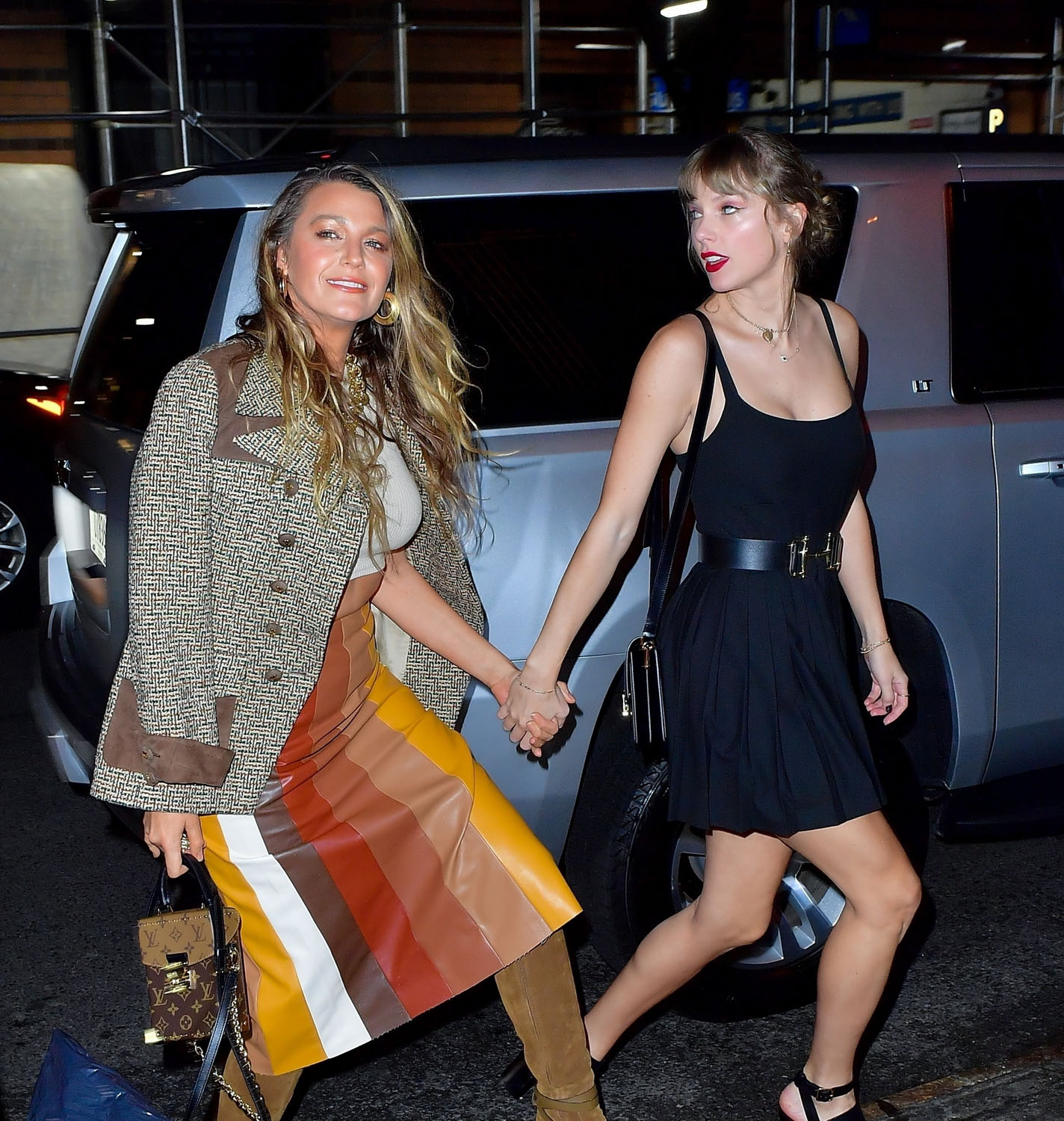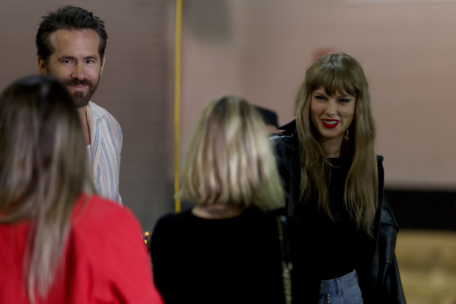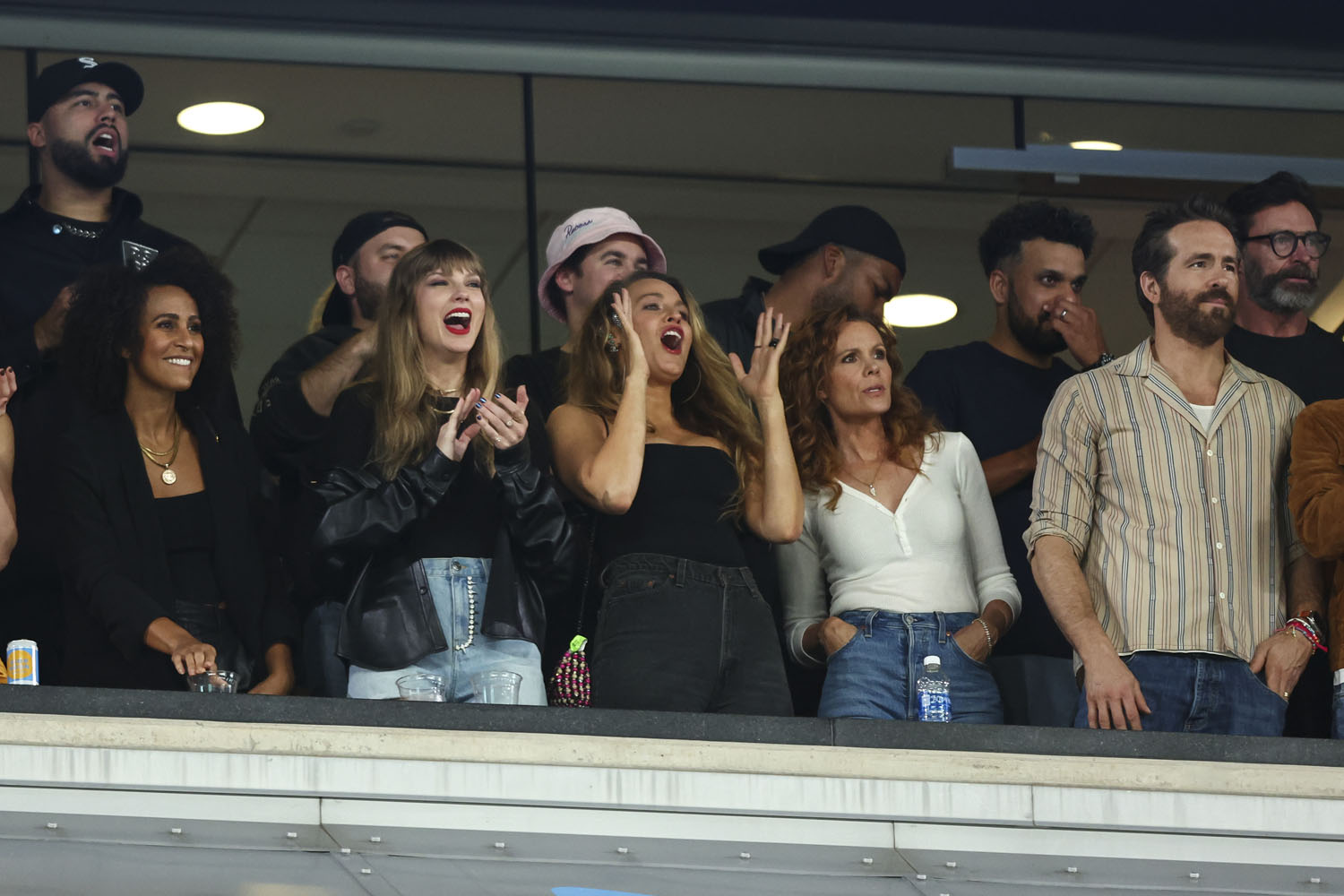 And now back to the rom-com, because we’re two weeks in and it’s been a great show. In another flex of her influence, Taylor stacked her suite yesterday with all kinds of celebrities. Here she is arriving with Blake Lively, Ryan Reynolds, Hugh Jackman, and Sabrina Carpenter.