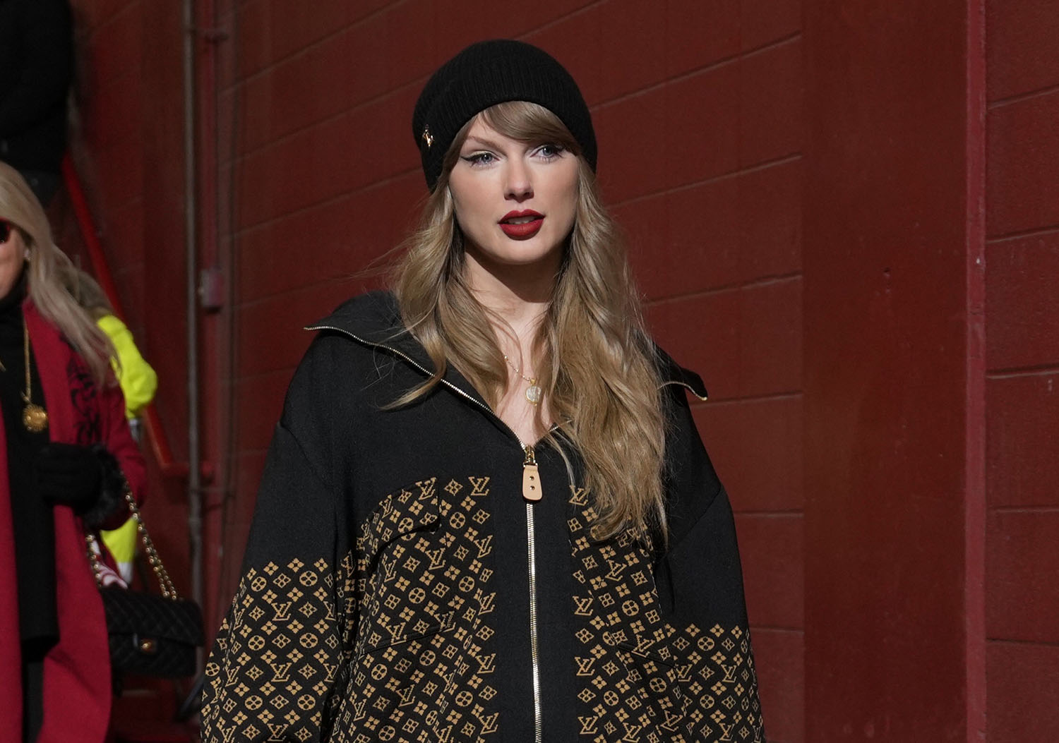 Anyway, Taylor turned up in a Lainey-approved outfit, head-to-toe Louis Vuitton with a tights/boots combo that I bet a lot of us rock during the winter.