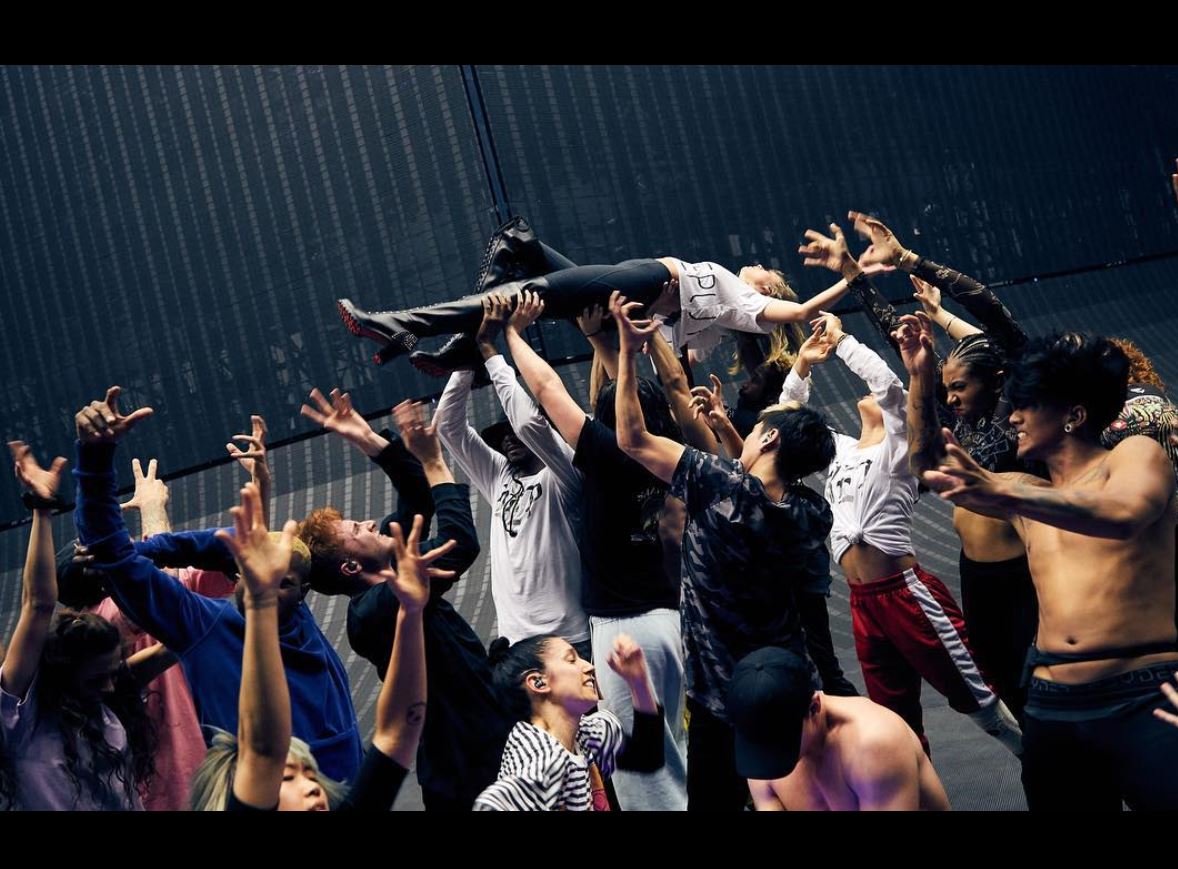 There follow several solo shots of the dancers captioned with a song lyric from Gorgeous and a shot of her with her custom in ears and then this shot of her being lifted, presumably during a performance of I Did Something Bad.