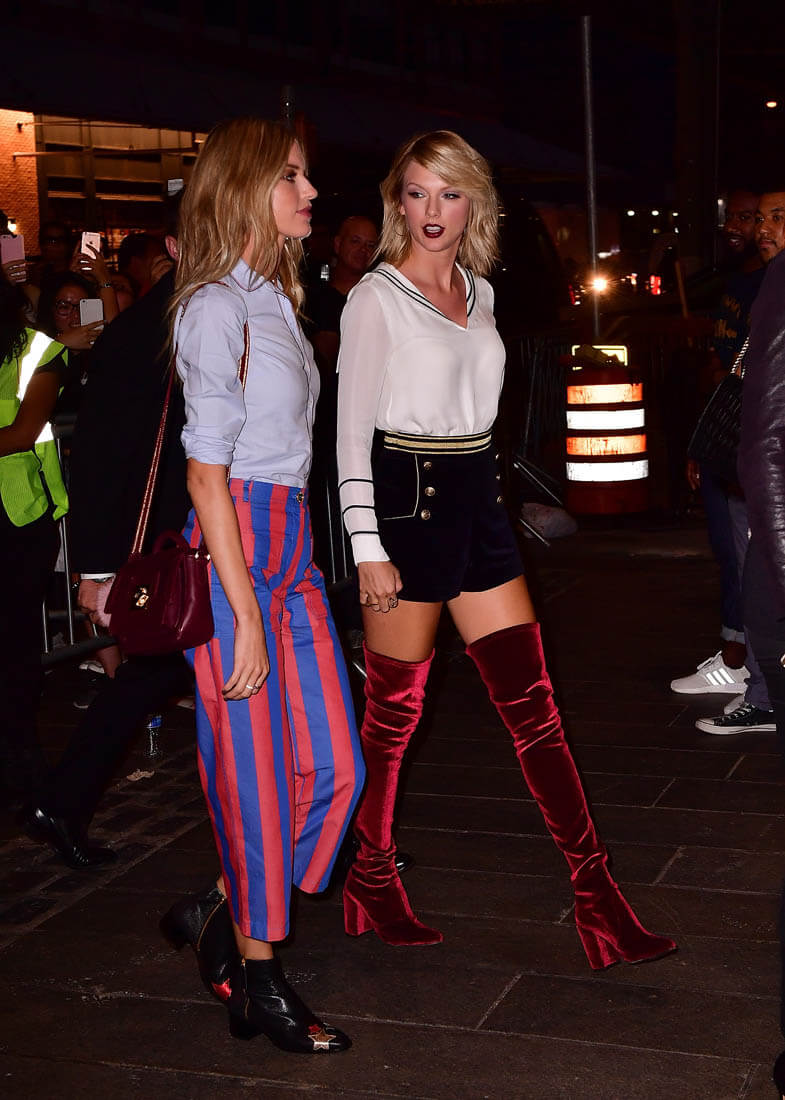 Taylor Swift’s post-Swoki media strategy/standard media strategy – friend armour – was played on Friday night at NY Fashion Week as she stepped out to support Gigi Hadid at the Tommy Hilfiger show. Gigi collaborated on a line with Hilfiger and Taylor sat front row, hootin’ and hollerin’ in her red velvet Gigi thigh-highs.
