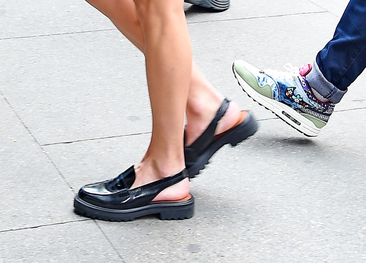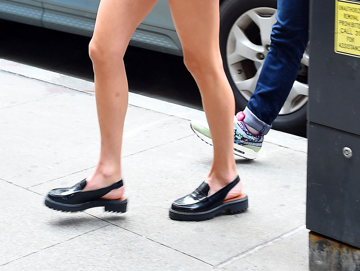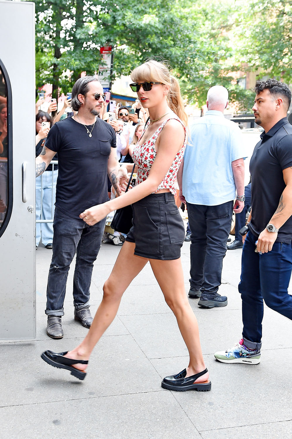 Taylor’s street clothes on the other hand – here she is again at the studio yesterday in a floral print corset tank that’s probably now sold out at Free People. But, to go back to the shoes, what do we think of the slingback loafer? Taylor’s are Reformation and I definitely like a lug sole loafer slingback more than a flat loafer slingback but the way I see it, a loafer is a perfect shoe, I’m not sure it needs to be in slingback form even with a flower print or a dress to mimic a sandal because, again, a loafer basically goes with anything.