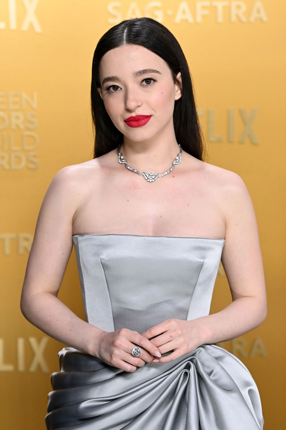 Mikey’s awards season fashion has been solid but not extraordinary. This gown is one of her better looks, maybe her best one so far—which suggests she’s ramping up for the Oscars next weekend. It’s styled perfectly with the necklace and bold red lip, and Mikey has such striking coloring with her very fair skin and very dark hair, the silver is a perfect complement. The whole look is just very cohesive.
