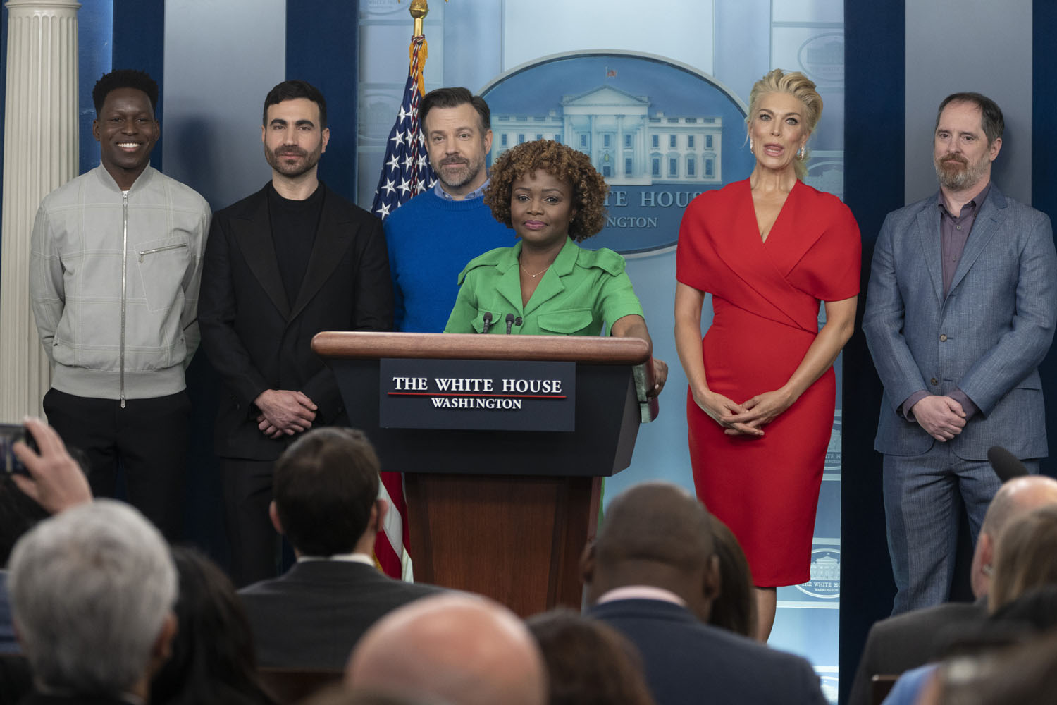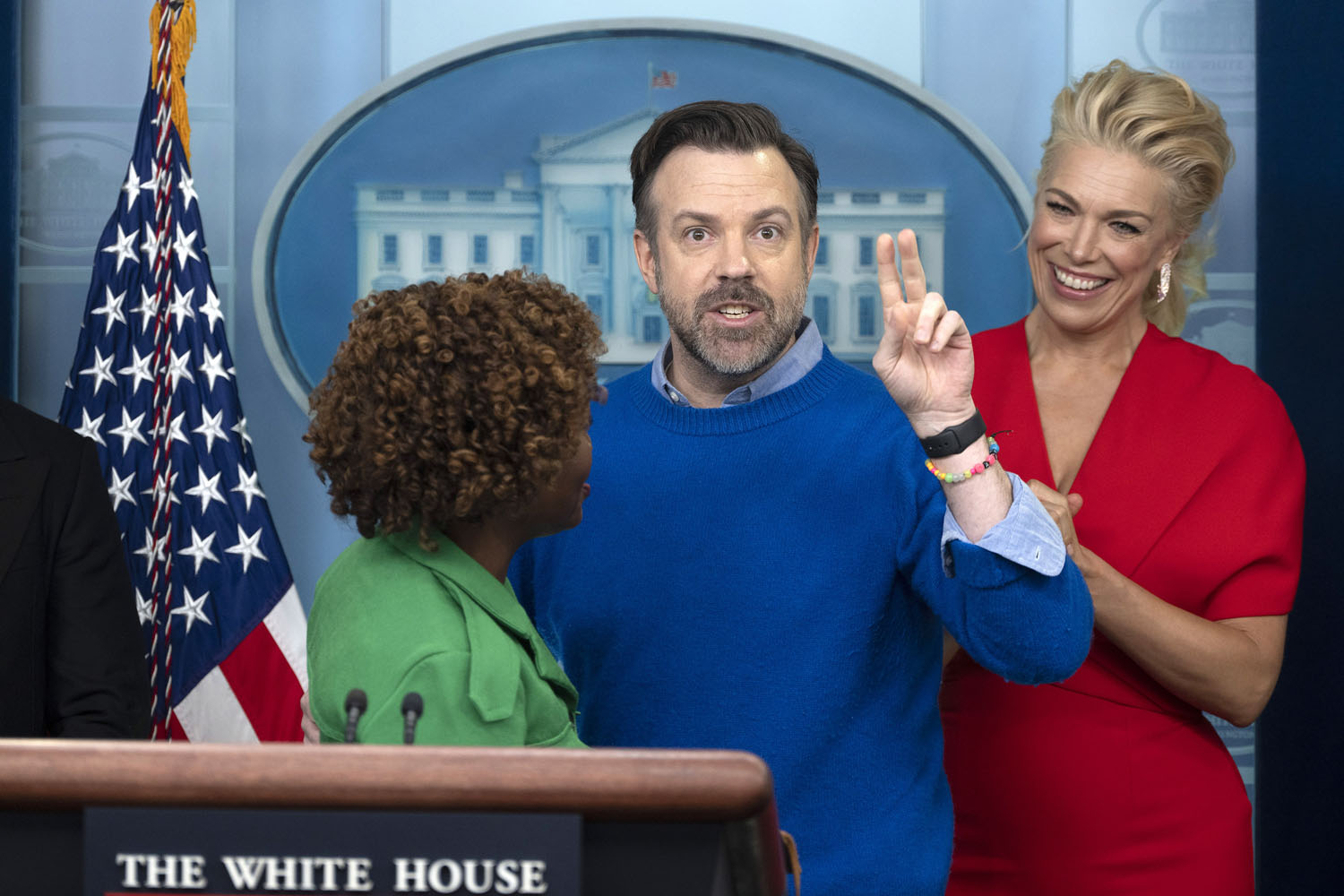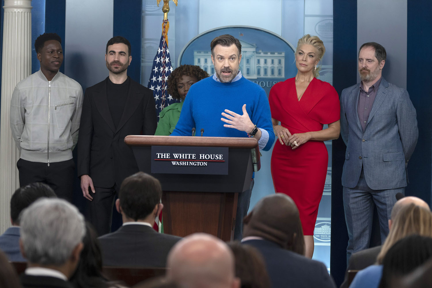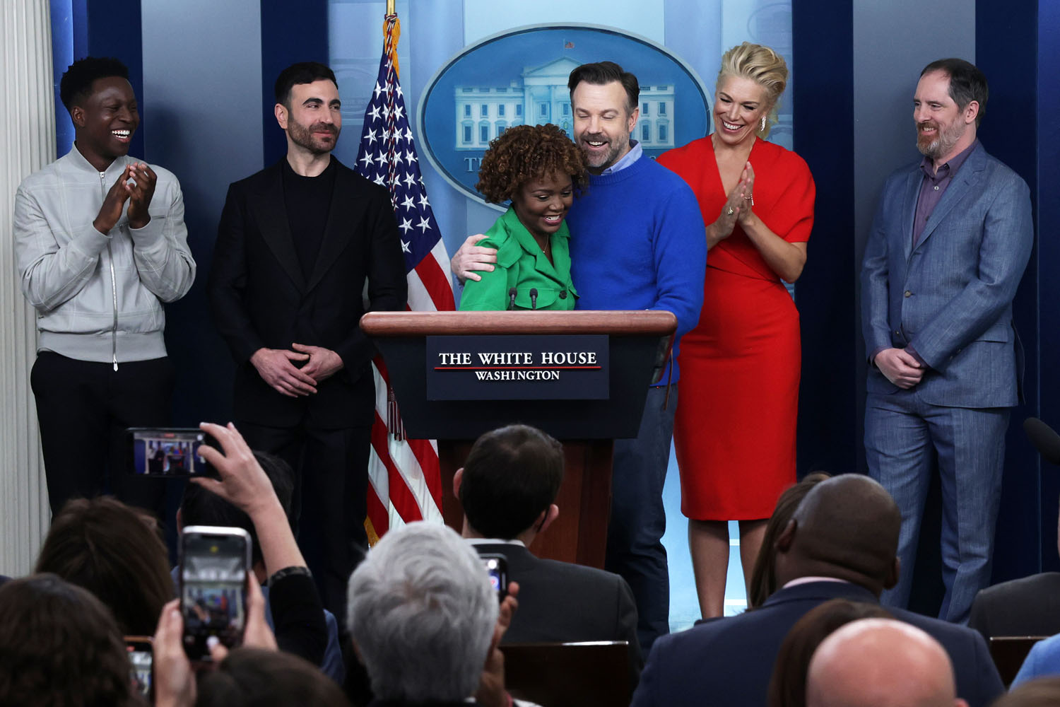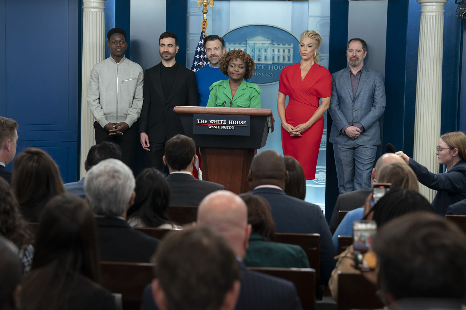 The show has also become a way of talking about mental health, as Ted’s struggle with anxiety and panic attacks is now a center-stage plotline, along with Nate’s parallel struggle with low self-esteem. It makes sense, then, that Jason Sudeikis and some of the Ted Lasso cast stopped by the White House yesterday to promote mental health awareness, which is part of President Biden’s “unity agenda”. Sudeikis appeared alongside Hannah Waddingham, Brendan Hunt, Brett Goldstein, and Toheeb Jimoh at a press briefing with Press Secretary Karine Jean-Pierre. Also present but not behind the lectern were Jeremy Swift, Phil Dunster, Cristo Fernández, and James Lance.