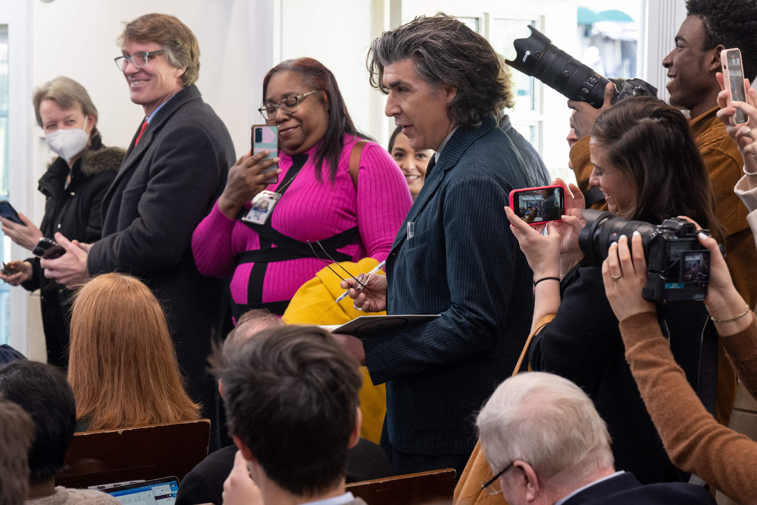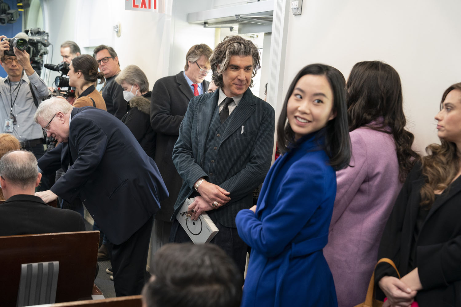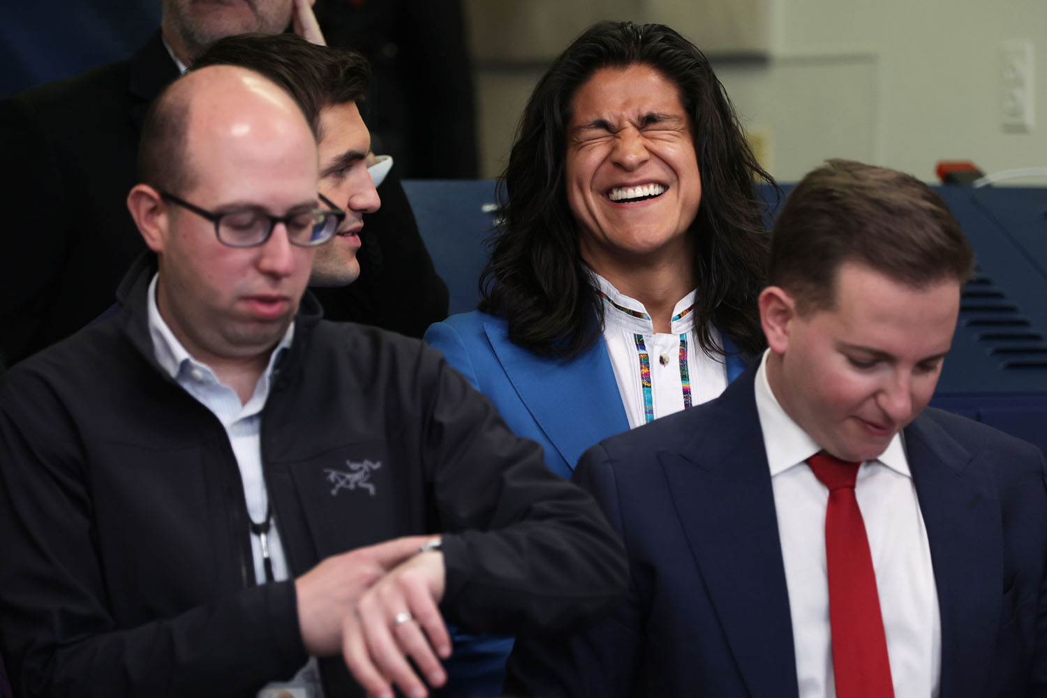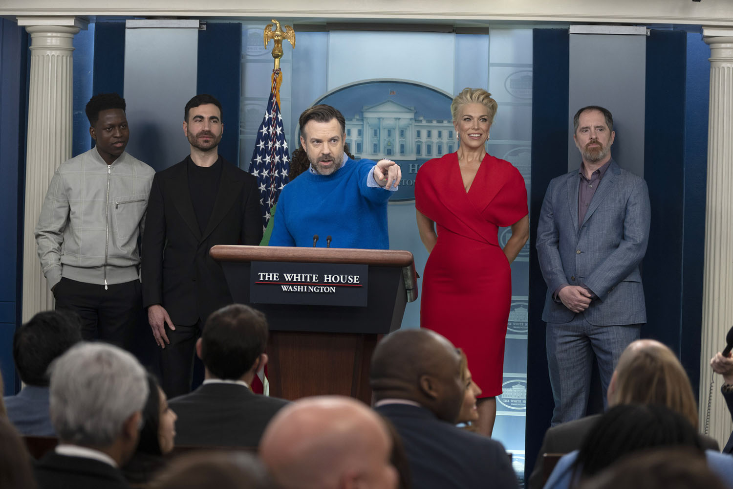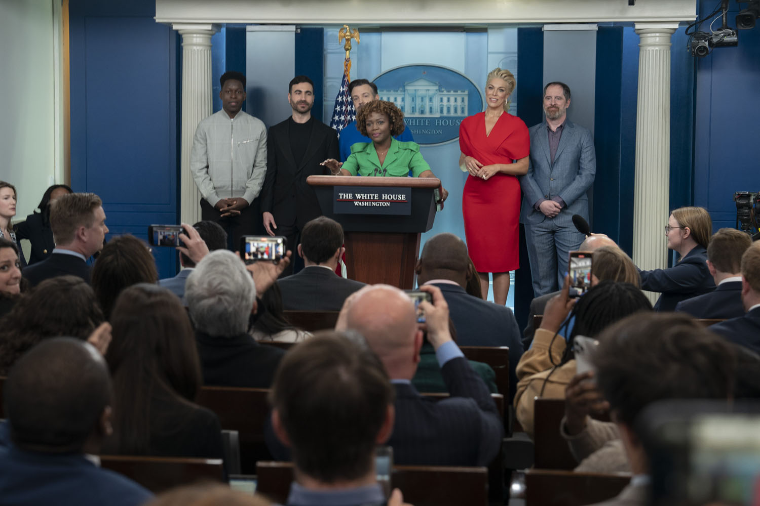 The show has also become a way of talking about mental health, as Ted’s struggle with anxiety and panic attacks is now a center-stage plotline, along with Nate’s parallel struggle with low self-esteem. It makes sense, then, that Jason Sudeikis and some of the Ted Lasso cast stopped by the White House yesterday to promote mental health awareness, which is part of President Biden’s “unity agenda”. Sudeikis appeared alongside Hannah Waddingham, Brendan Hunt, Brett Goldstein, and Toheeb Jimoh at a press briefing with Press Secretary Karine Jean-Pierre. Also present but not behind the lectern were Jeremy Swift, Phil Dunster, Cristo Fernández, and James Lance.