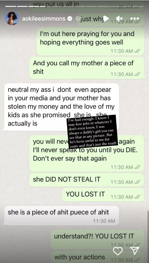 “I’m out here praying for you and hoping everything goes well. And you call my mother a piece of s–t. … Don’t ever say that again. She DID NOT STEAL IT. YOU LOST IT,” Aoki’s response read.