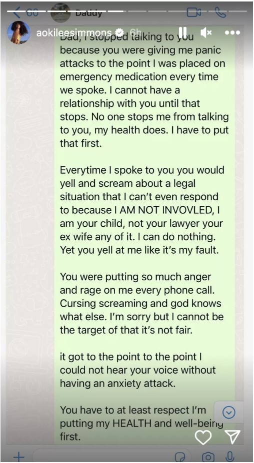 Aoki posted a screenshot of a lengthy message she sent to her dad, informing him that she quit speaking to him because he was giving her “panic attacks” and subsequently was placed on emergency medication each time they spoke. She also shared a muted video of Russell visibly yelling to back up her claims that their phone calls were always filled with hostility.