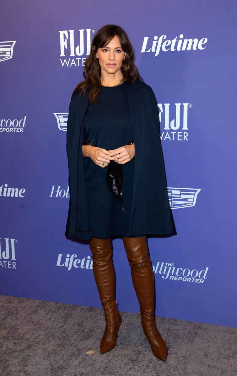 Jennifer Garner was at the Women in Entertainment event as a presenter last night for the Mentorships and Scholarships program. And by her standards, this is a bit of a risk for her. The dress with the black cape is for sure in her style lane…but the brown boots are a bit of a surprise to me. She even made a joke about the boots at the top of her speech – video is below.