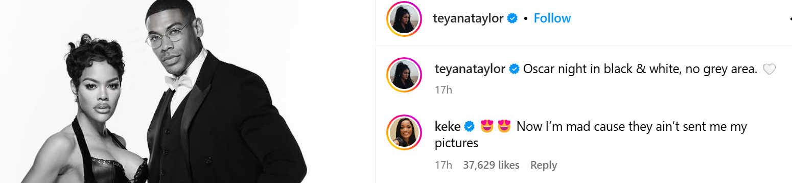 On Oscar night they made the party circuit rounds and staggered their arrivals and entrances, because they were saving it for Instagram. A hard launch! Aaron posted without a caption, but Teyana’s caption, to me at least, is all the explanation we need.