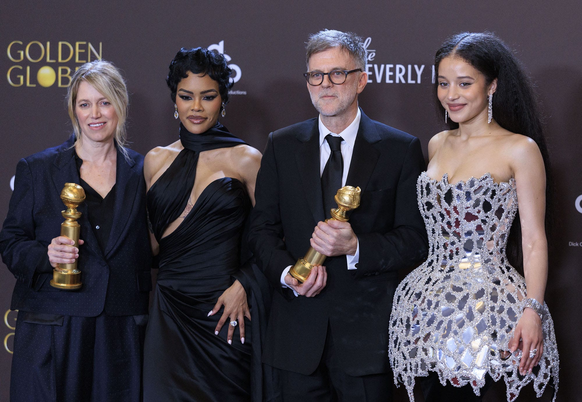 Sara Murphy, Teyana Taylor, Paul Thomas Anderson, and Chase Infiniti, winners of the Best Motion Picture - Musical or Comedy award for "One Battle After Another," pose in the press room during the 83rd annual Golden Globe Awards at The Beverly Hilton on January 11, 2026