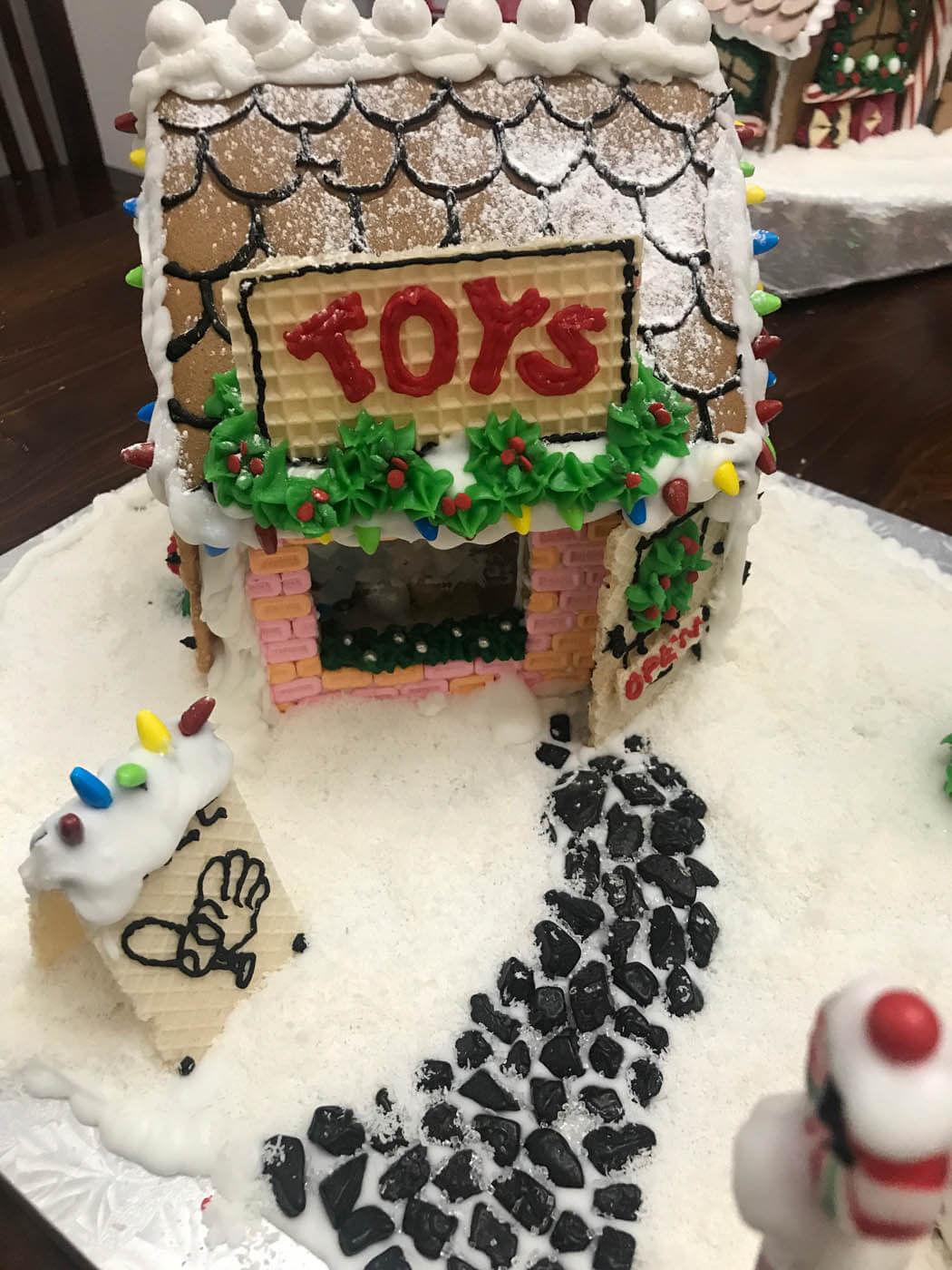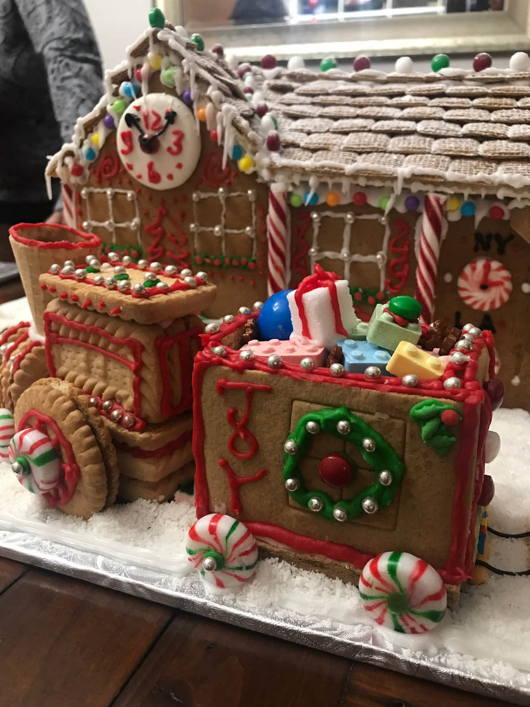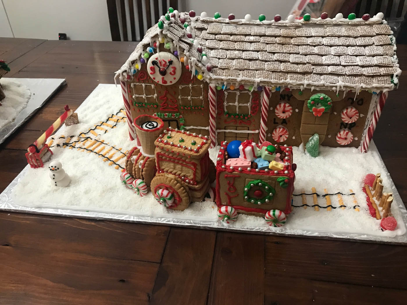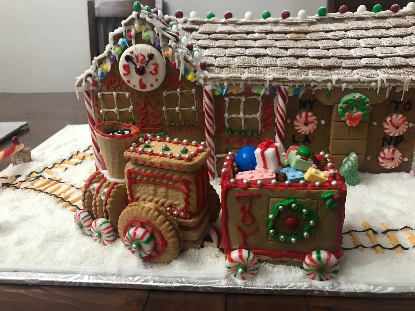All aboard this festive train station and locomotive! This sizable entry features a snowy Shreddie roof and a chocolate-covered Oreo clock. The train is constructed from a variety of cookies, and chugs along with an overflowing cart of treats and candy Lego brick presents down a crunchy chow mein noodle track. Peppermint sticks adorn the time zone peppermint clock wall. The station is covered in tiny hand-piped icicles and silver dragees.