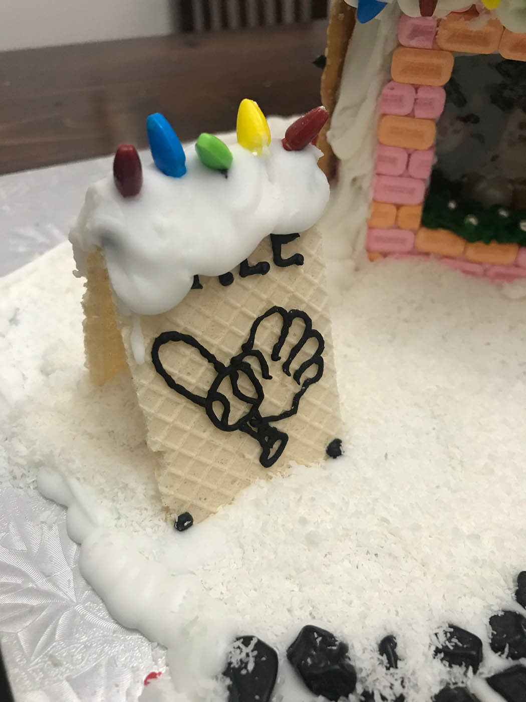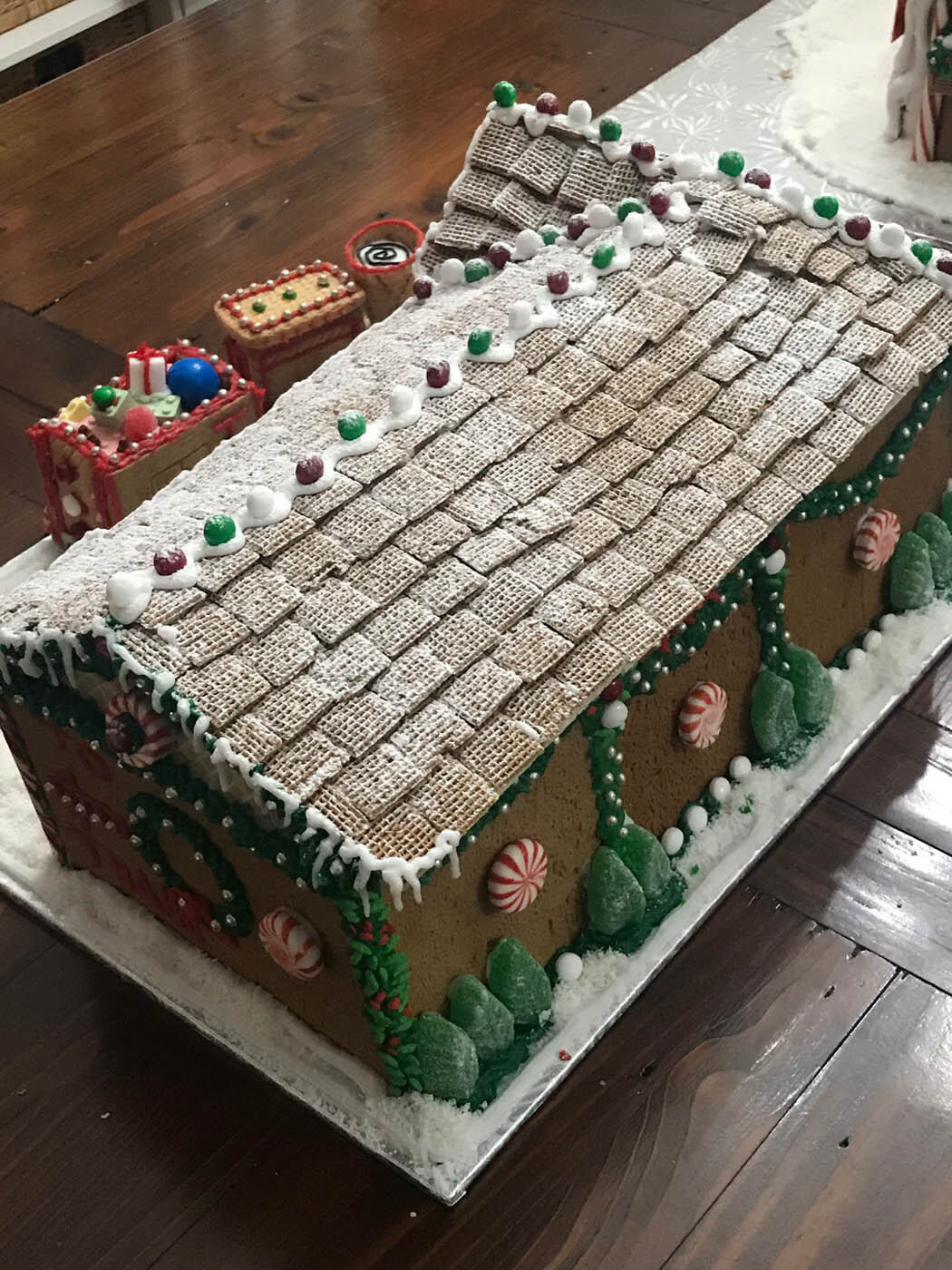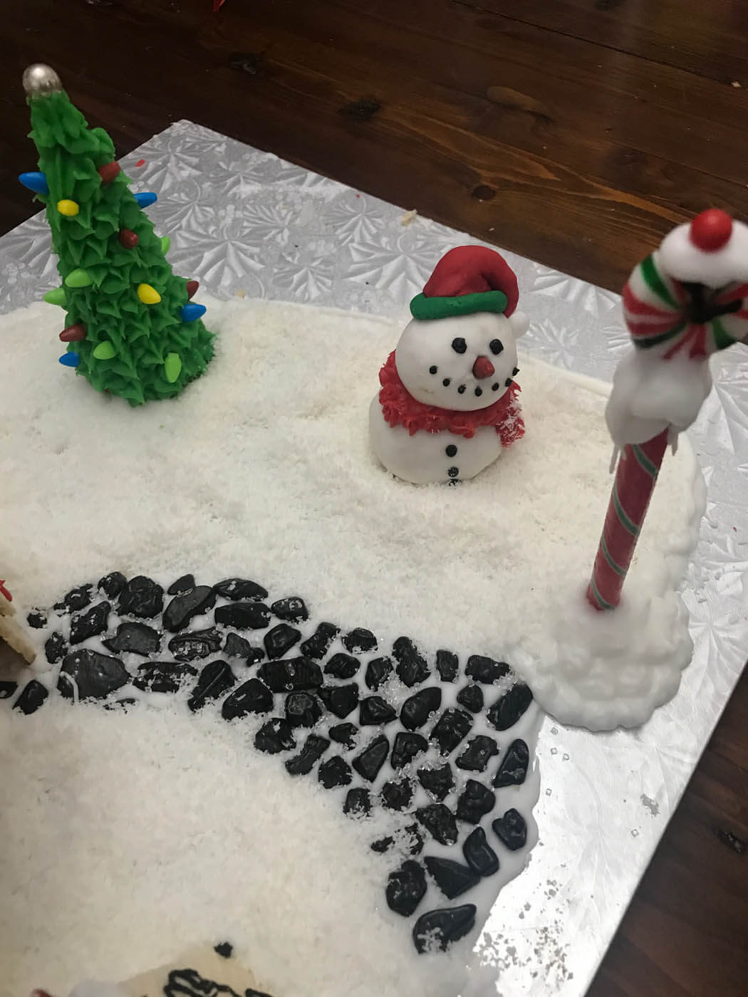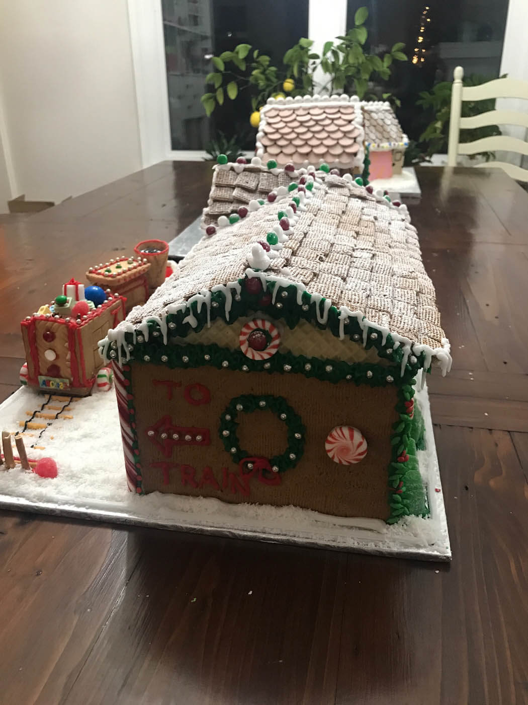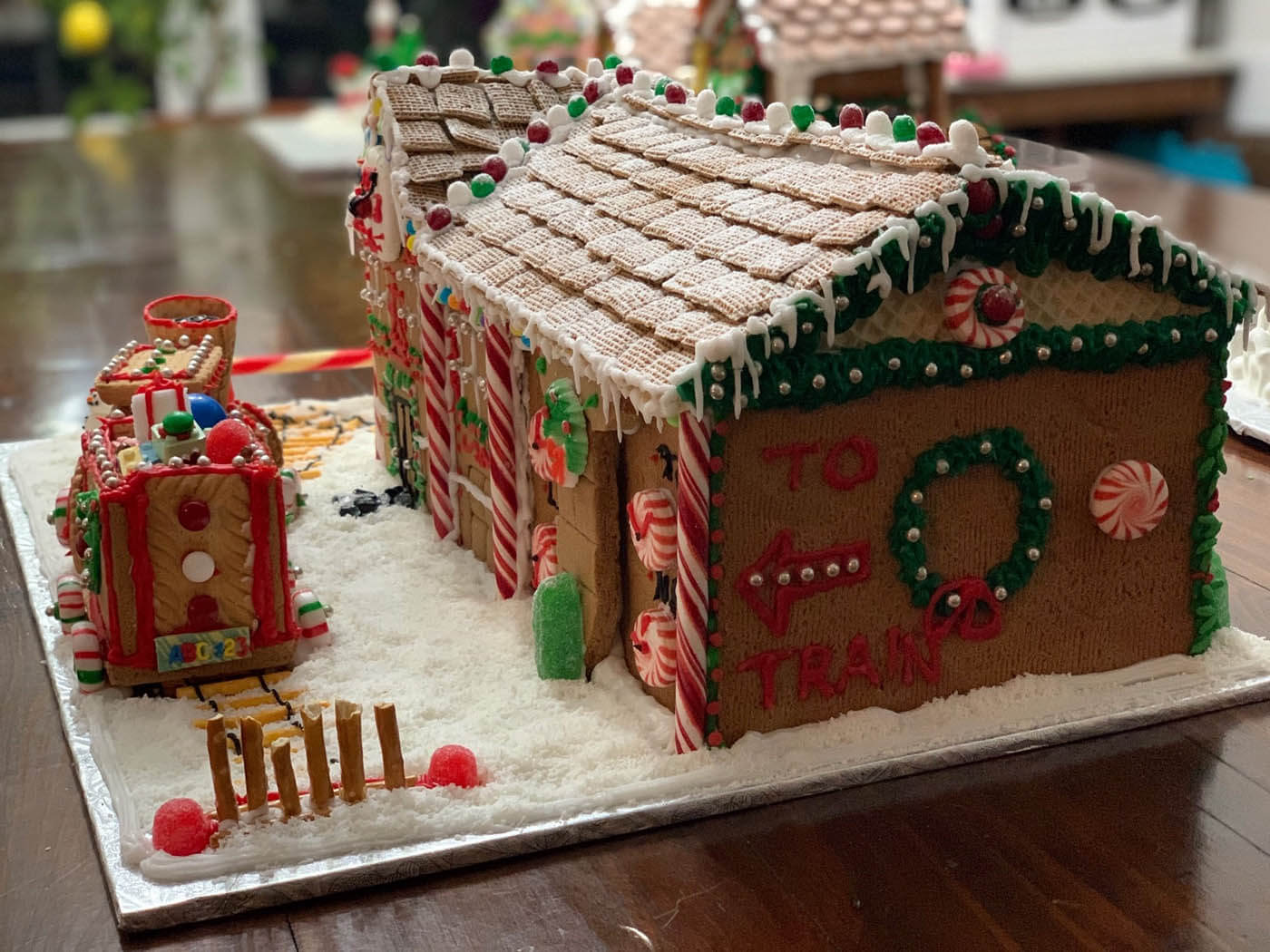 All aboard this festive train station and locomotive! This sizable entry features a snowy Shreddie roof and a chocolate-covered Oreo clock. The train is constructed from a variety of cookies, and chugs along with an overflowing cart of treats and candy Lego brick presents down a crunchy chow mein noodle track. Peppermint sticks adorn the time zone peppermint clock wall. The station is covered in tiny hand-piped icicles and silver dragees.