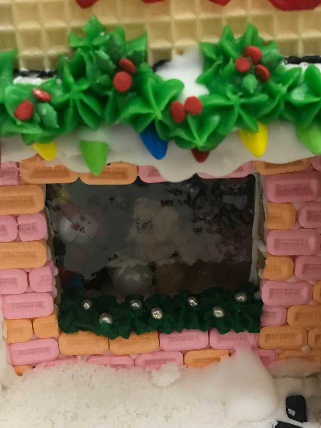This magical little entry is neatly covered in pastel pez “bricks”, features a roof sign and snow-covered sandwich board made of wafer, and a peppermint stick lamp post. A little fondant figure has his nose and mittens pressed to the glass (gelatin sheets!) and peers inside at the fully furnished interior, complete with an adorable Rice Krispie treat teddy bear, colourful little clown and tiny ca$h register!