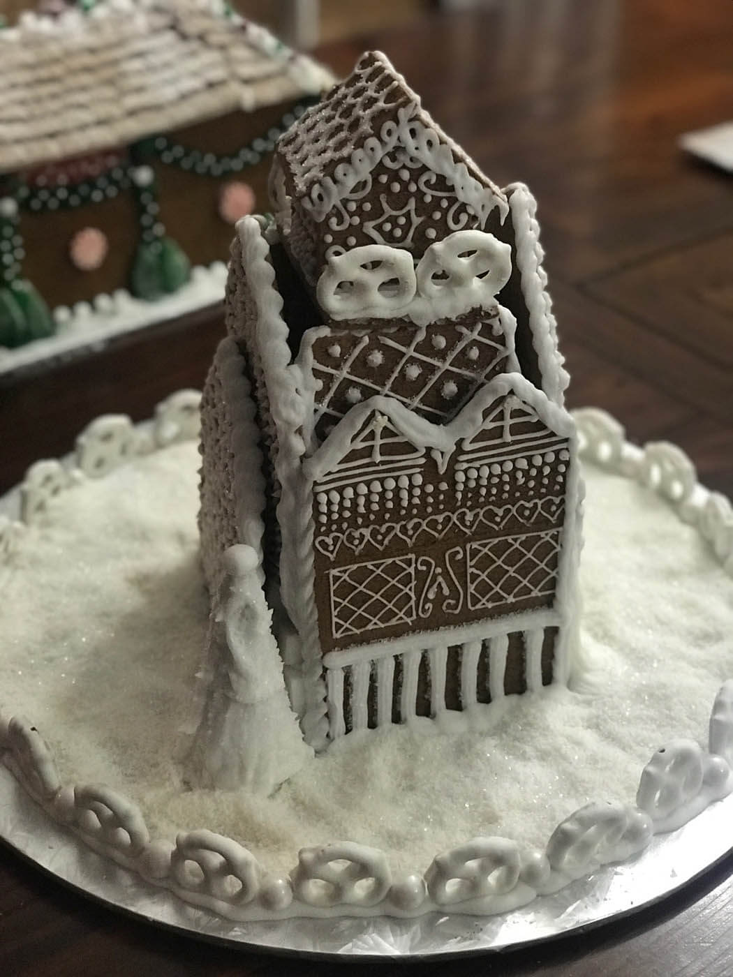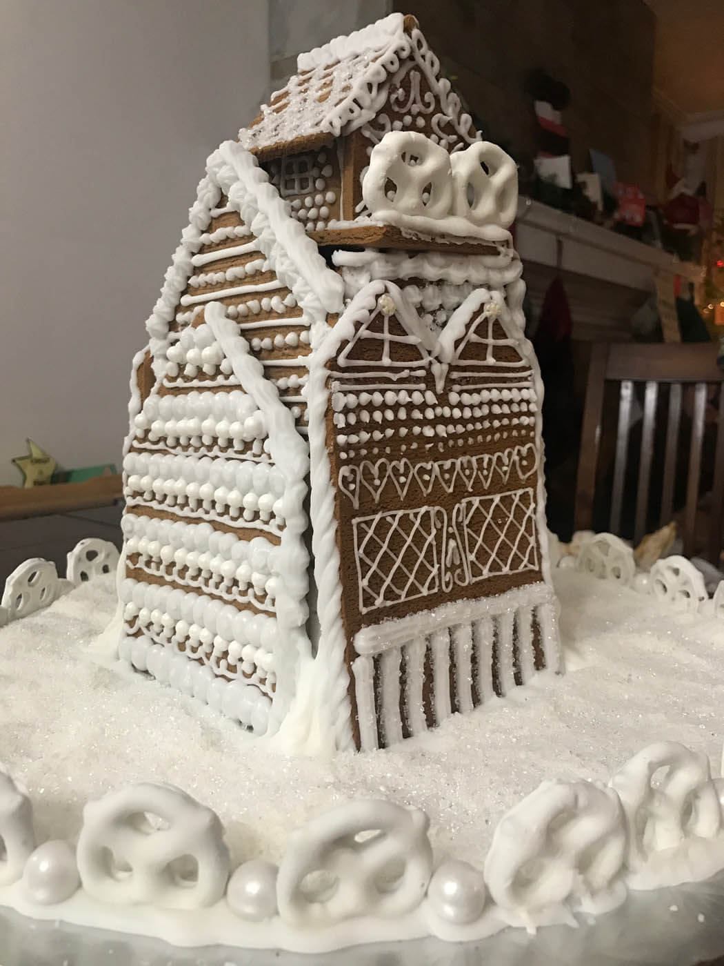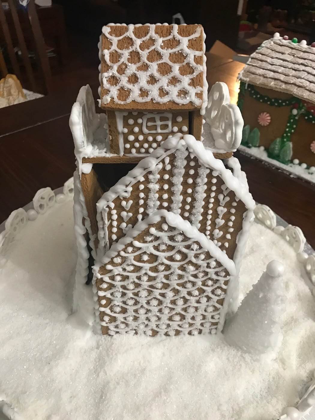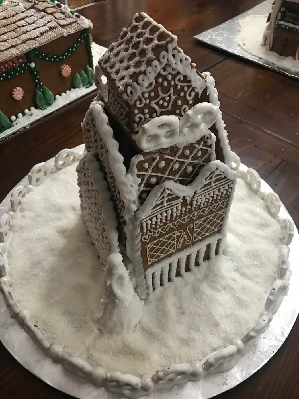 This tall entry features 6 separate facades and a tiny cottage perched on top. Piping was the focus of this all-white entry, which features a yogurt covered pretzel and pearly gumball fence. Royal icing dots, shells, hearts and stars cover the walls and sanding sugar adds some holiday shine.