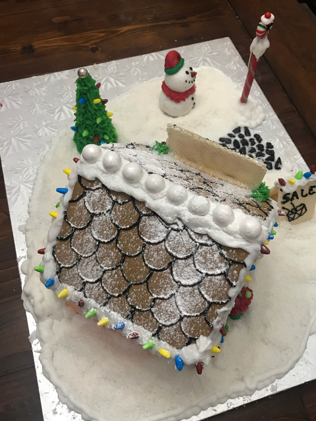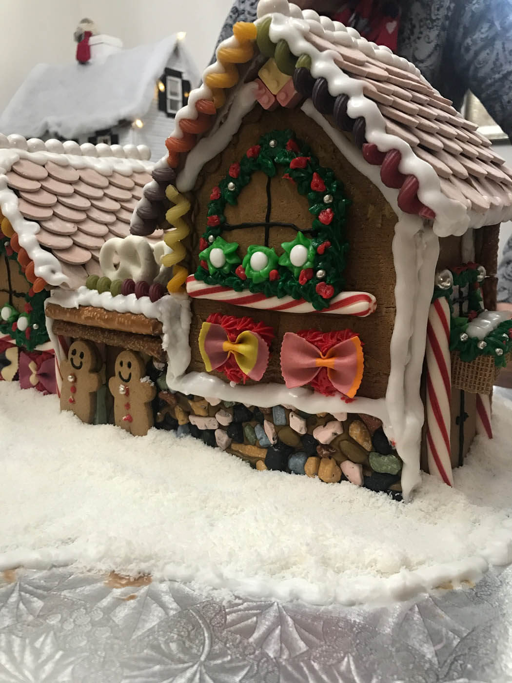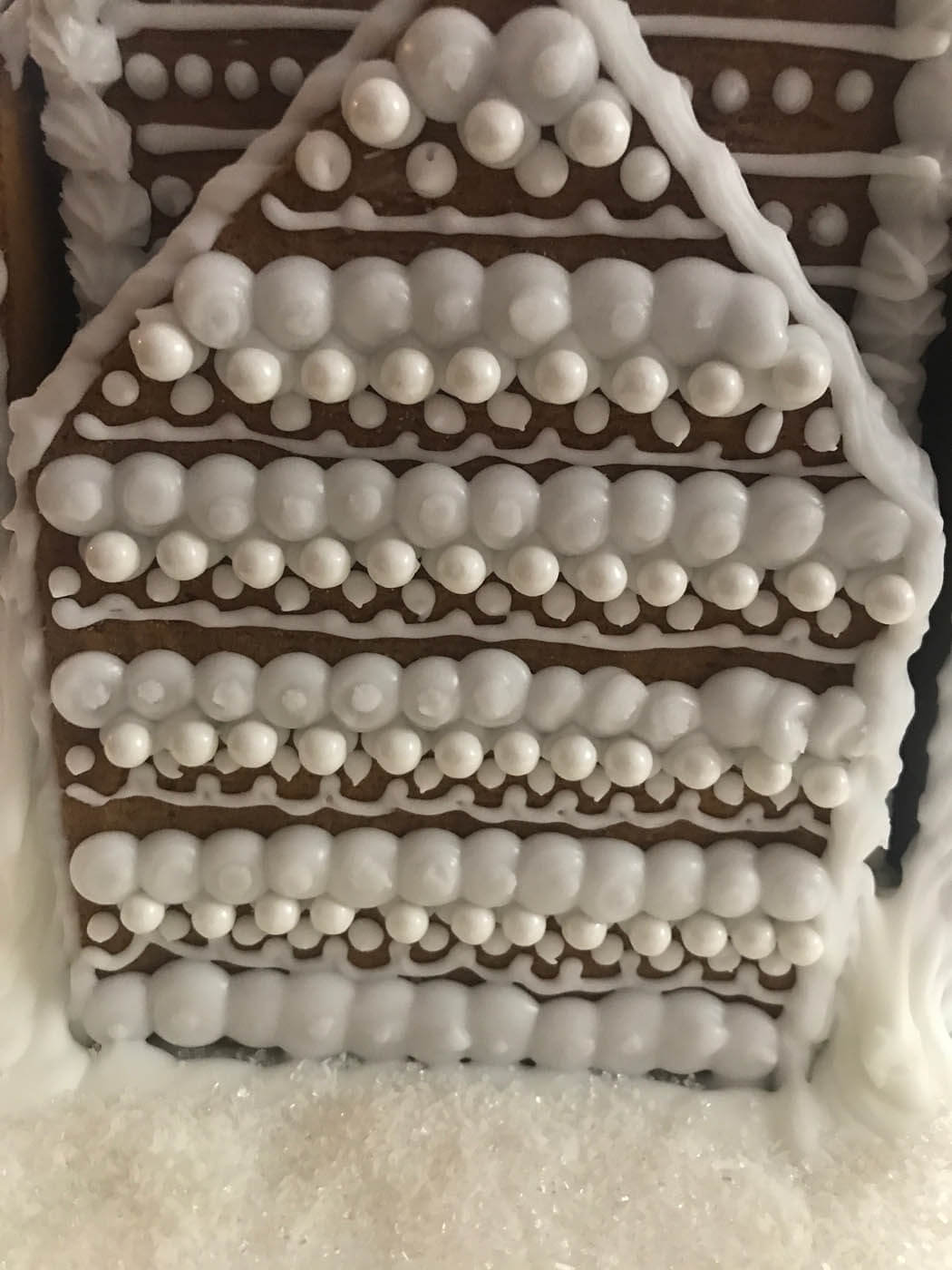 This tall entry features 6 separate facades and a tiny cottage perched on top. Piping was the focus of this all-white entry, which features a yogurt covered pretzel and pearly gumball fence. Royal icing dots, shells, hearts and stars cover the walls and sanding sugar adds some holiday shine.