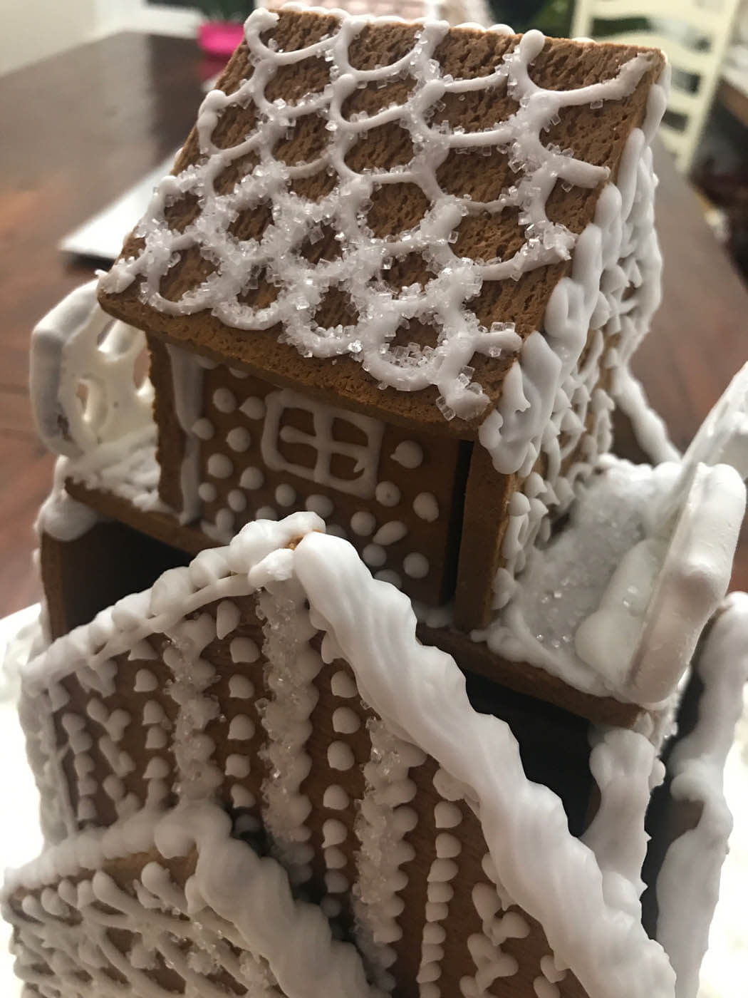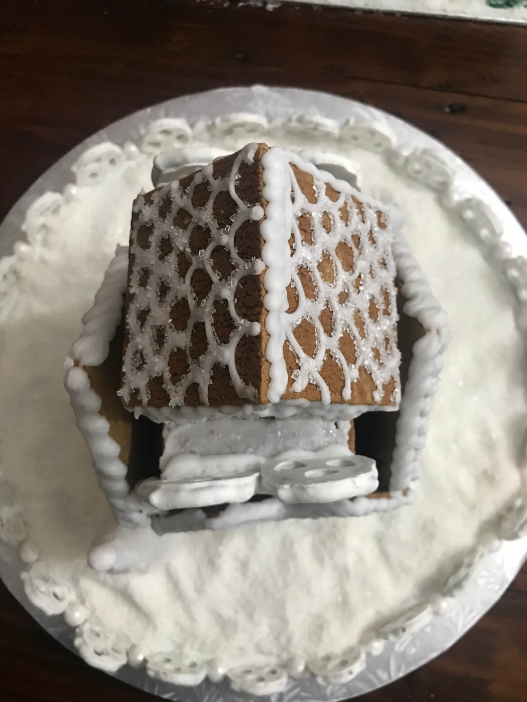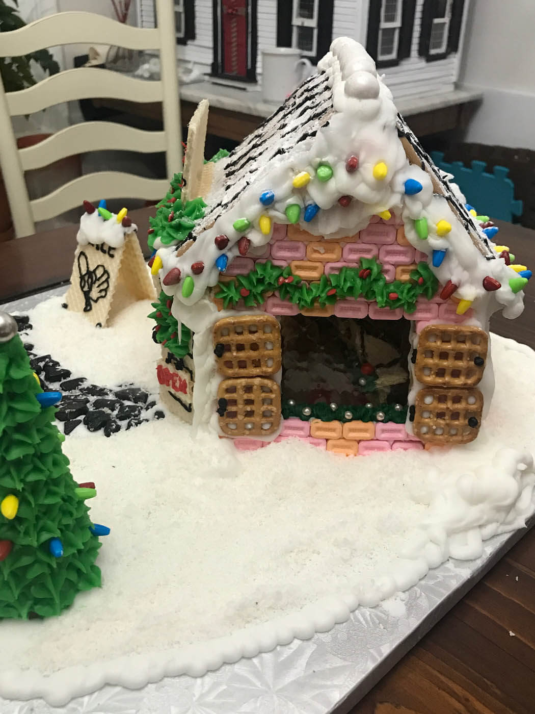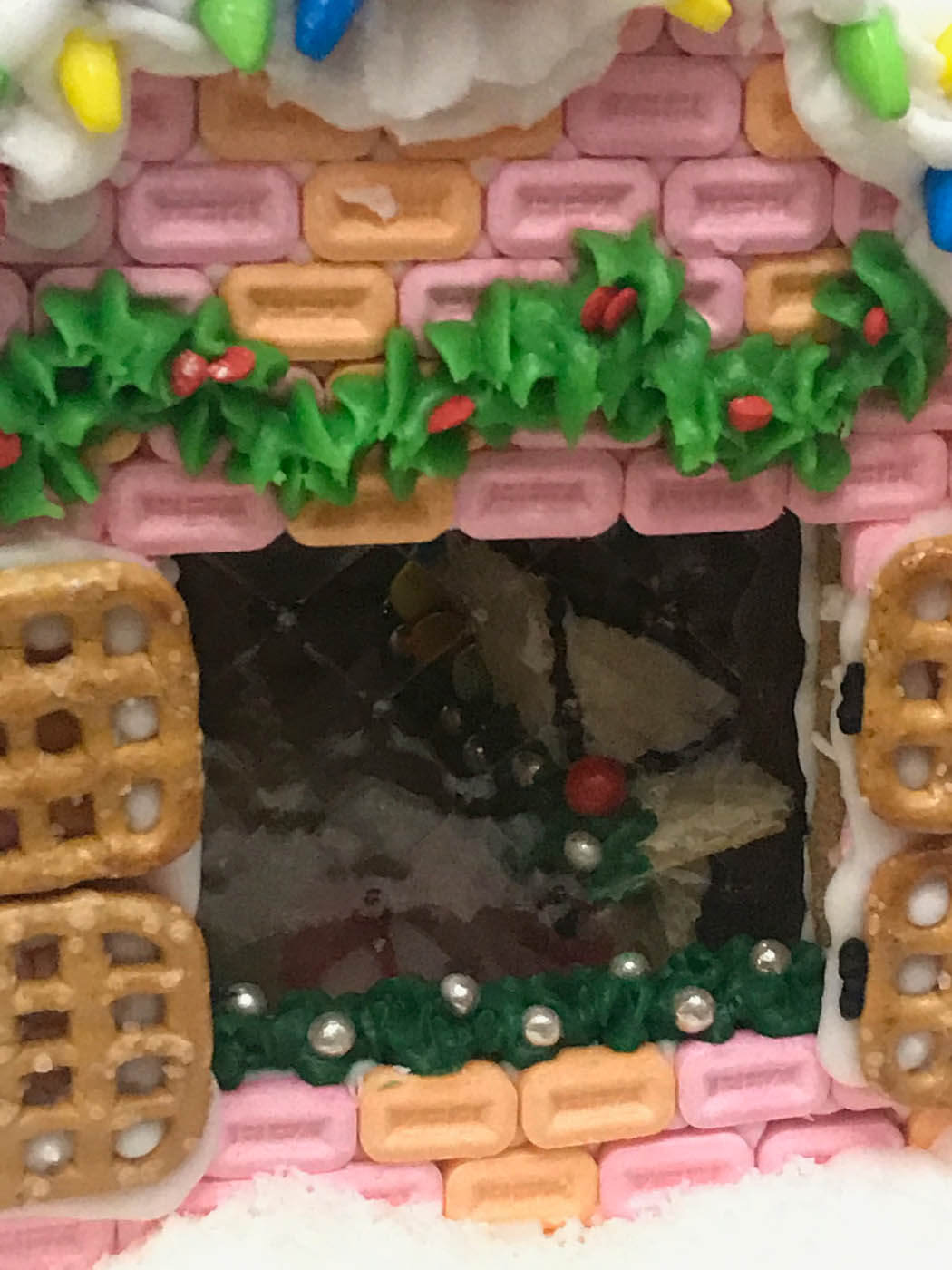 This tall entry features 6 separate facades and a tiny cottage perched on top. Piping was the focus of this all-white entry, which features a yogurt covered pretzel and pearly gumball fence. Royal icing dots, shells, hearts and stars cover the walls and sanding sugar adds some holiday shine.