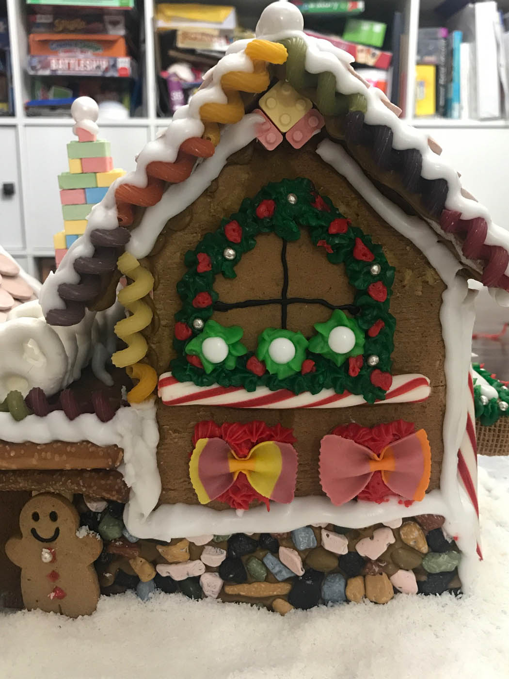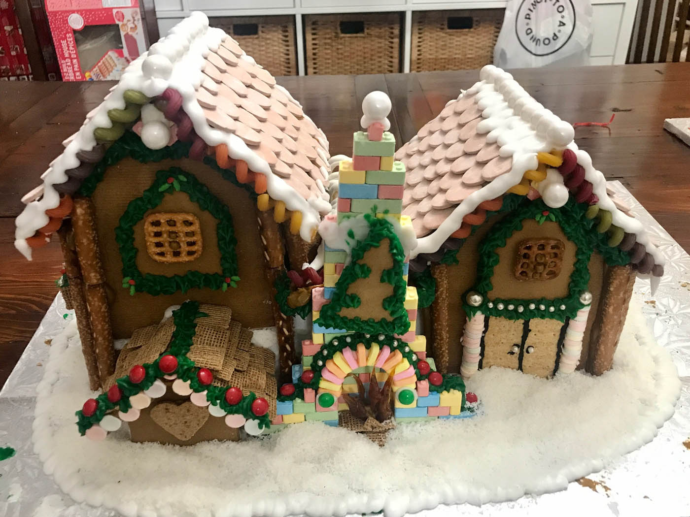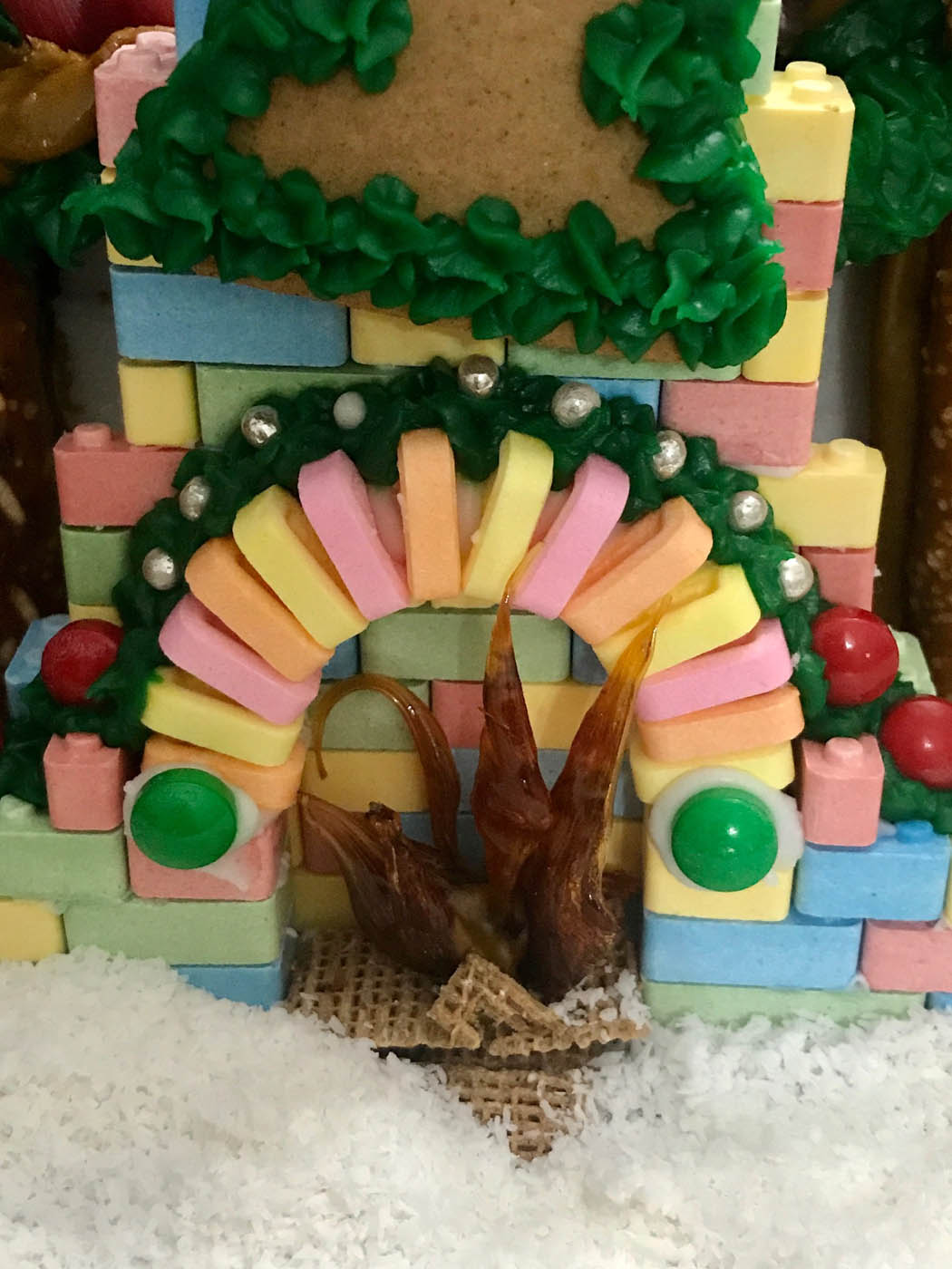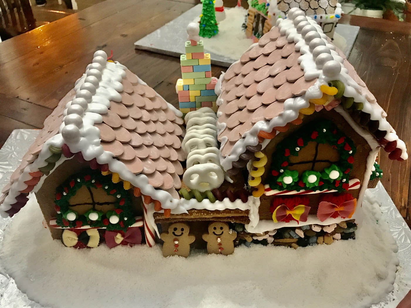 Taking its inspiration from the Lego gingerbread house set, this impressive entry features a double multi-level Necco wafer roof and a soaring Candy Lego brick and pez fireplace with a roaring melted-and-hand-pulled candy fire. Rainbow pasta corkscrews and bow ties adorn the colourful facade, and pearly white gum balls line the snowy crest of each rooftop.