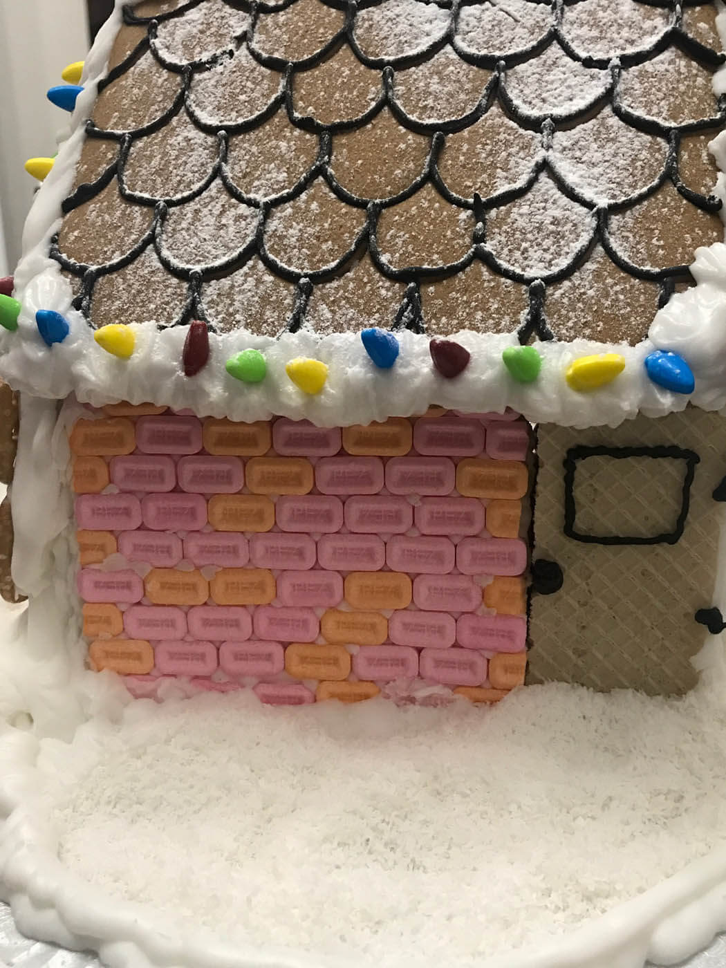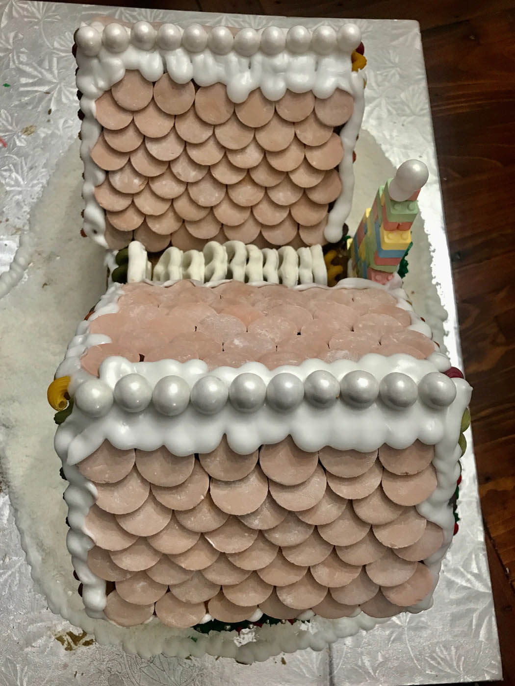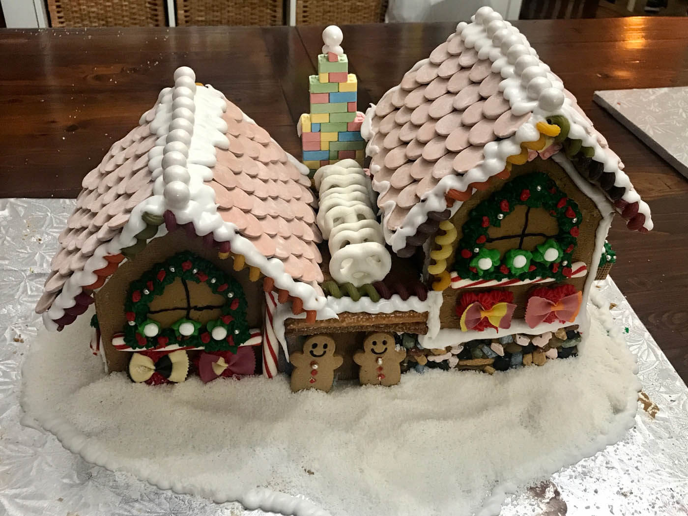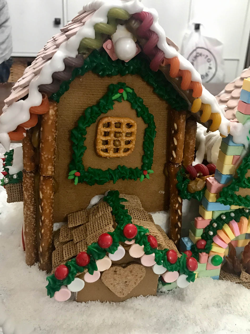 Taking its inspiration from the Lego gingerbread house set, this impressive entry features a double multi-level Necco wafer roof and a soaring Candy Lego brick and pez fireplace with a roaring melted-and-hand-pulled candy fire. Rainbow pasta corkscrews and bow ties adorn the colourful facade, and pearly white gum balls line the snowy crest of each rooftop.