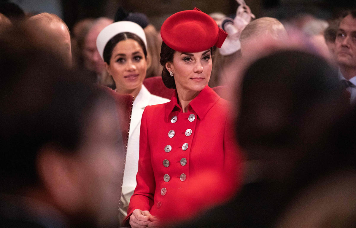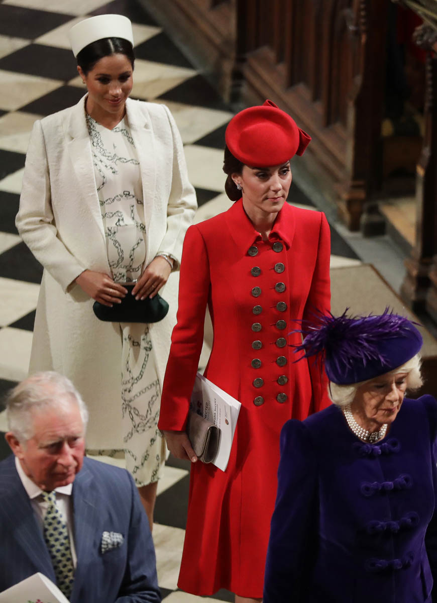 Kate’s wearing Catherine Walker, a military style coat from her closet. Meghan showed up in white, same as last year on Commonwealth Day. This time the white covered a Victoria Beckham dress and I quite like this hat on her. Can we call it a pillbox? Like a Jackie Kennedy style pillbox? It’s a good look on her and I only wish she’d worn her hair down because the way it is here, with the middle part and her hair pulled back, it’s a little nursey which is what Gary Janetti is getting at: