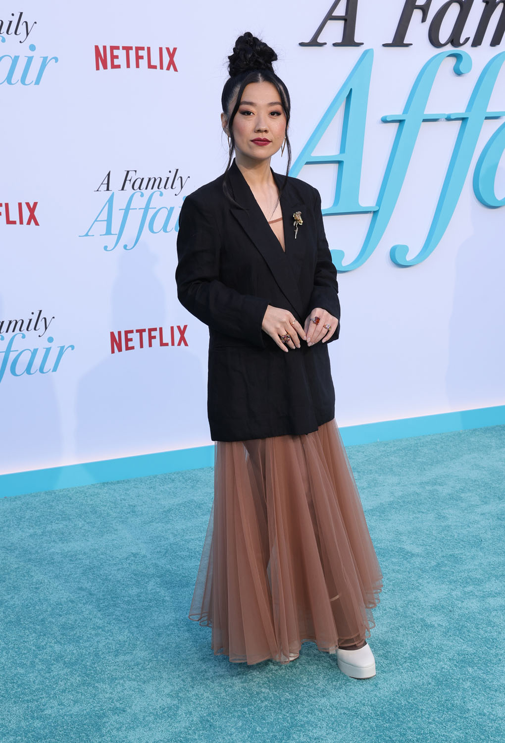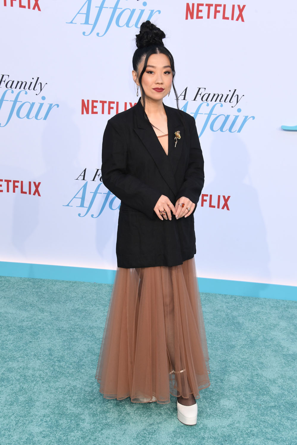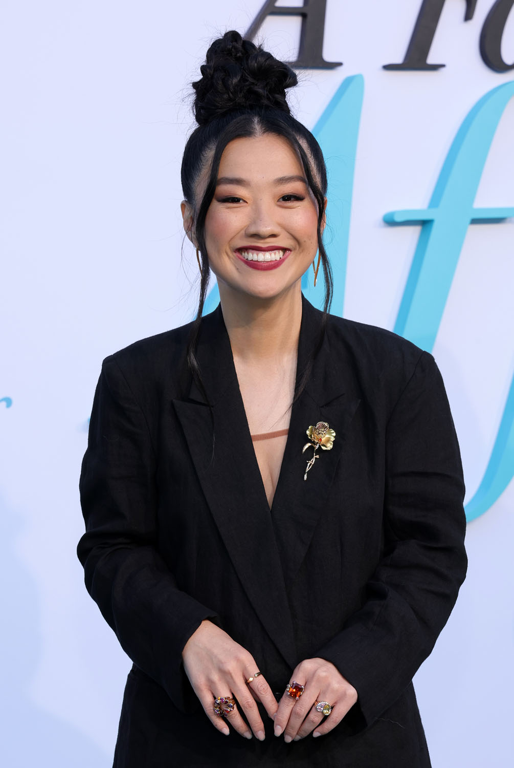 Next, it’s so good to see Sherry Cola back out this summer with another comedy a year after Joy Ride. She looks great in this sheer dress under a long black blazer but the main event is her hair. It’s a great topknot, I might have to jack this.